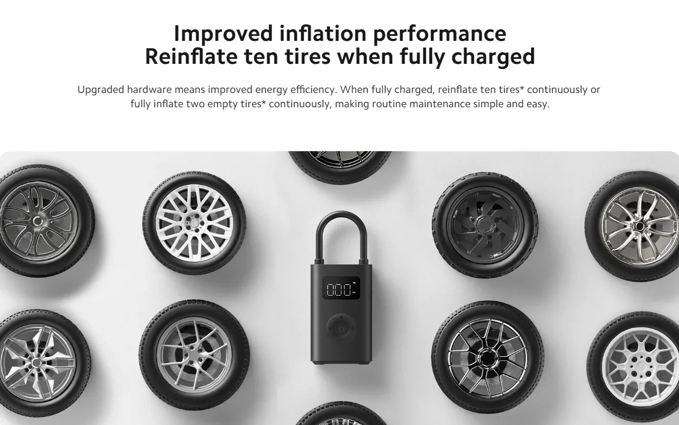 El hardware actualizado significa una mayor eficiencia energética. Cuando esté completamente cargado, vuelva a inflar diez neumáticos * continuamente o infle dos neumáticos vacíos * continuamente, haciendo que el mantenimiento de rutina sea simple y fácil.