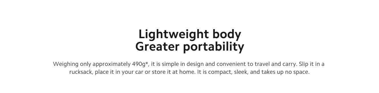 Con un peso aproximado de solo 490G *, su diseño es sencillo y cómodo de transportar. Deslícelo en una mochila, colóquelo en su automóvil o guárdelo en casa. Es compacto, elegante y no ocupa espacio.