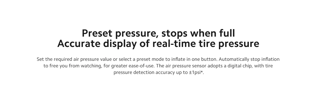 Establezca el valor de presión de aire requerido o Seleccione un modo preestablecido para inflar en un botón. Detenga automáticamente la información para liberarlo de ver, para una mayor facilidad de uso. El sensor de presión de aire adopta un chip digital, con precisión de detección de presión de hasta ± 1psi *