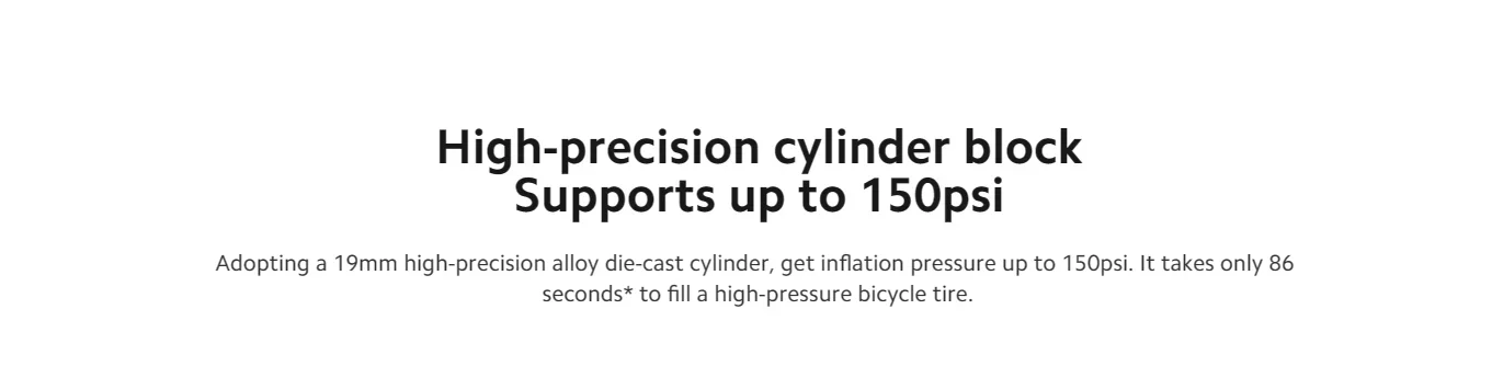 Adoptando un cilindro fundido a presión de aleación de alta precisión de 19mm, obtenga una presión de inflado de hasta 150psi. Solo se necesitan 86 segundos * para llenar un neumático de bicicleta de alta presión.