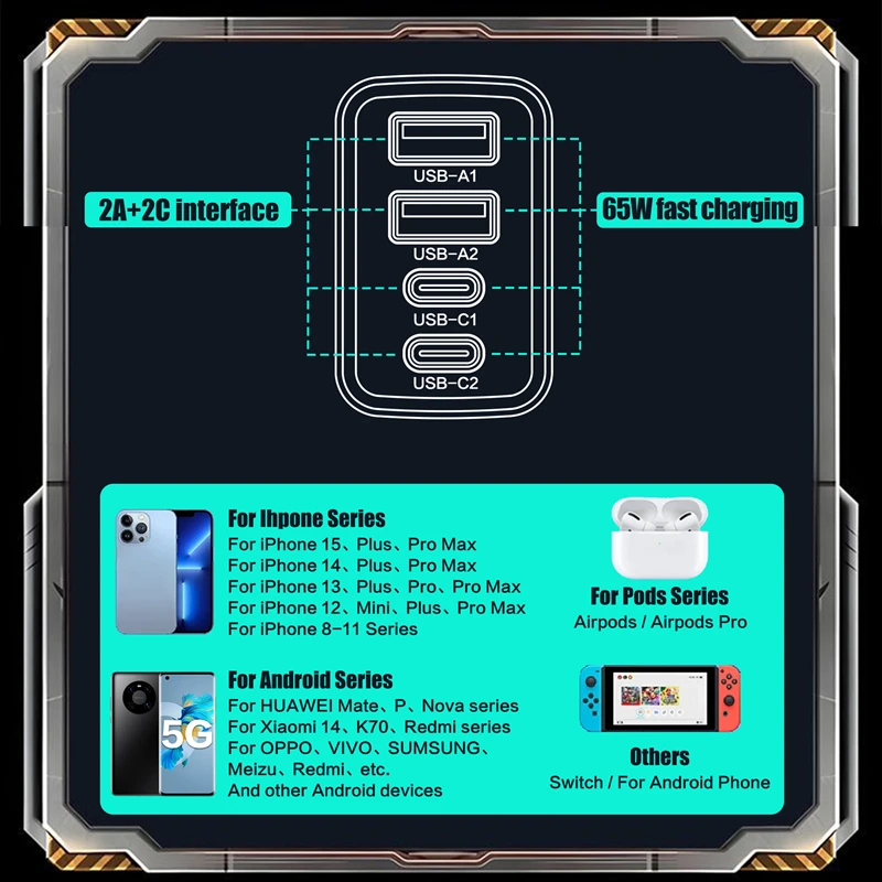 Nuestro cargador Mech Wind de cuatro puertos 65 es una potente fuente de alimentación en un paquete pequeño diseñado para proporcionar una carga de alta velocidad para sus dispositivos.El tamaño es adecuado para viajes o uso familiar y no ocupará demasiado espacio.