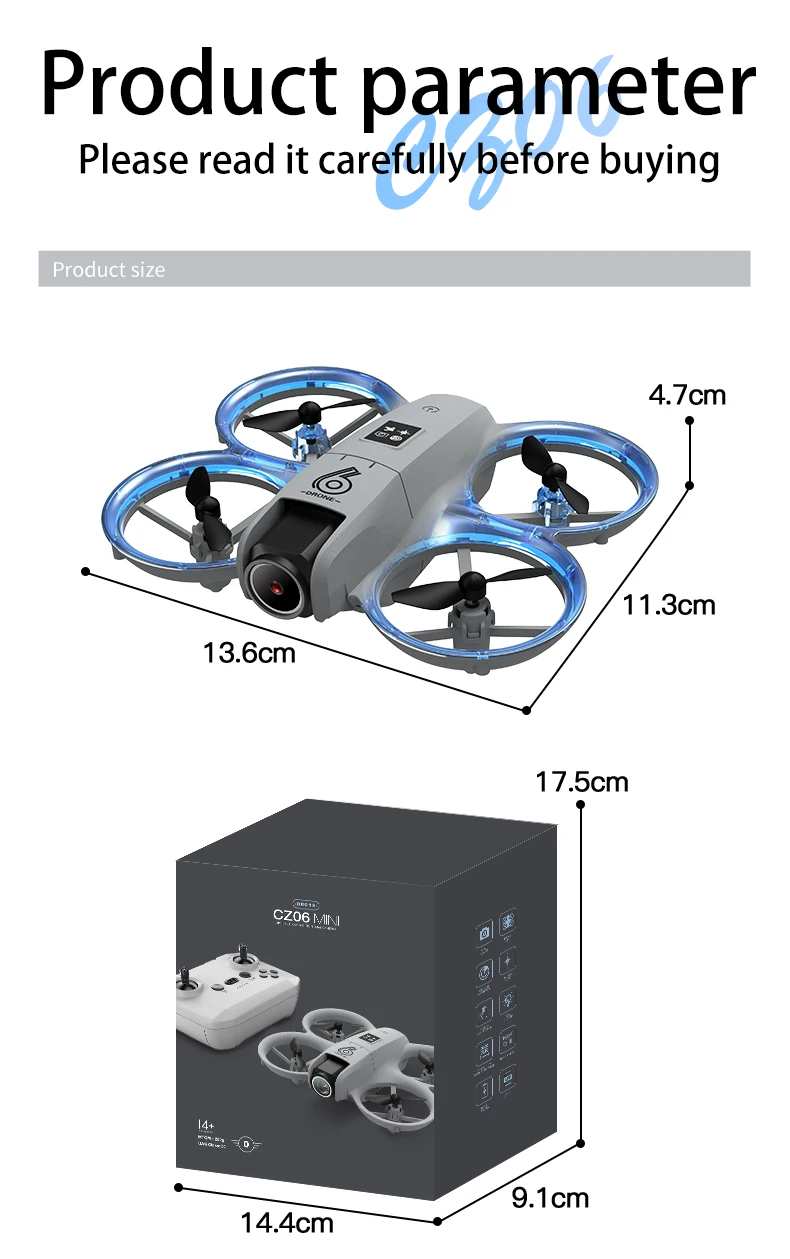 Dimensiones del cuadricóptero: 17*13*7,5 centímetros