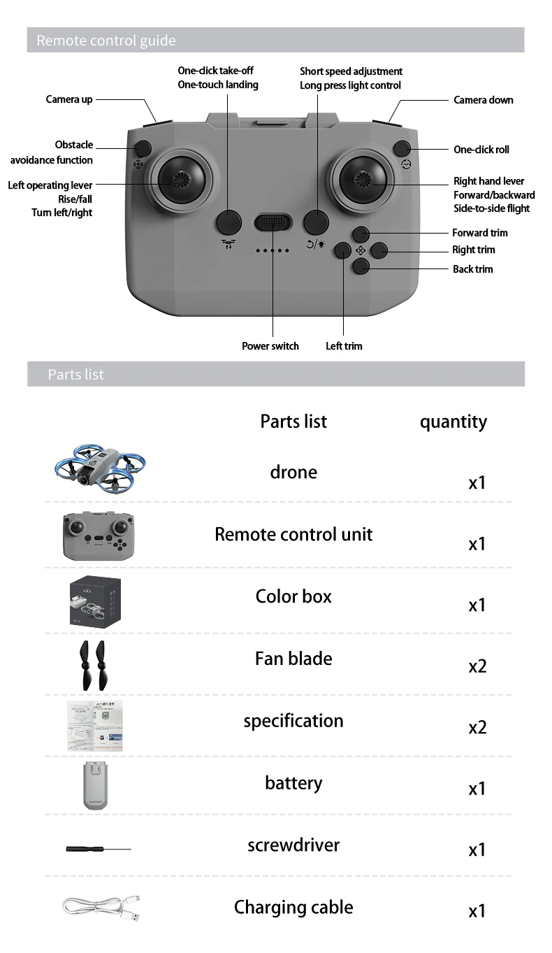 Función de control remoto: Despegue con una sola tecla/Aterrizaje con una sola tecla/Subida/Descenso/Giro a la izquierda y a la derecha/Adelante/Vuelo hacia la izquierda/Vuelo hacia el lado derecho/Posicionamiento de flujo óptico/ Cámaras duales/ Rodamiento/ Modo sin cabeza / Engranajes rápidos y lentos/ Restablecimiento con una sola tecla/ Control de iluminación/ Evitación de obstáculos