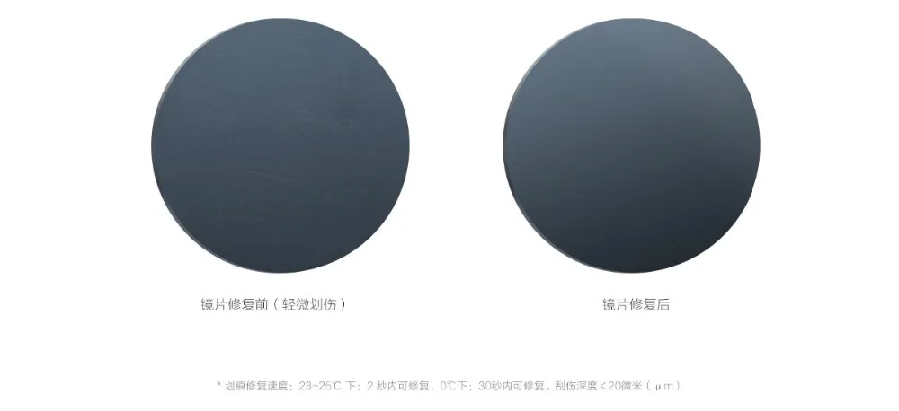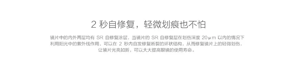 Both the inner and outer layers of the lens have SR self-healing coating. When the SR self-repairing layer of the lens is used within the range of 20 μm scratch depth, the ultraviolet rays in the sunlight can be used to repair the broken ring spontaneously within 2 seconds. The structure, which repairs the slight scratch on the lens, makes the lens bright as new, which can greatly improve the service life of the lens. twenty one