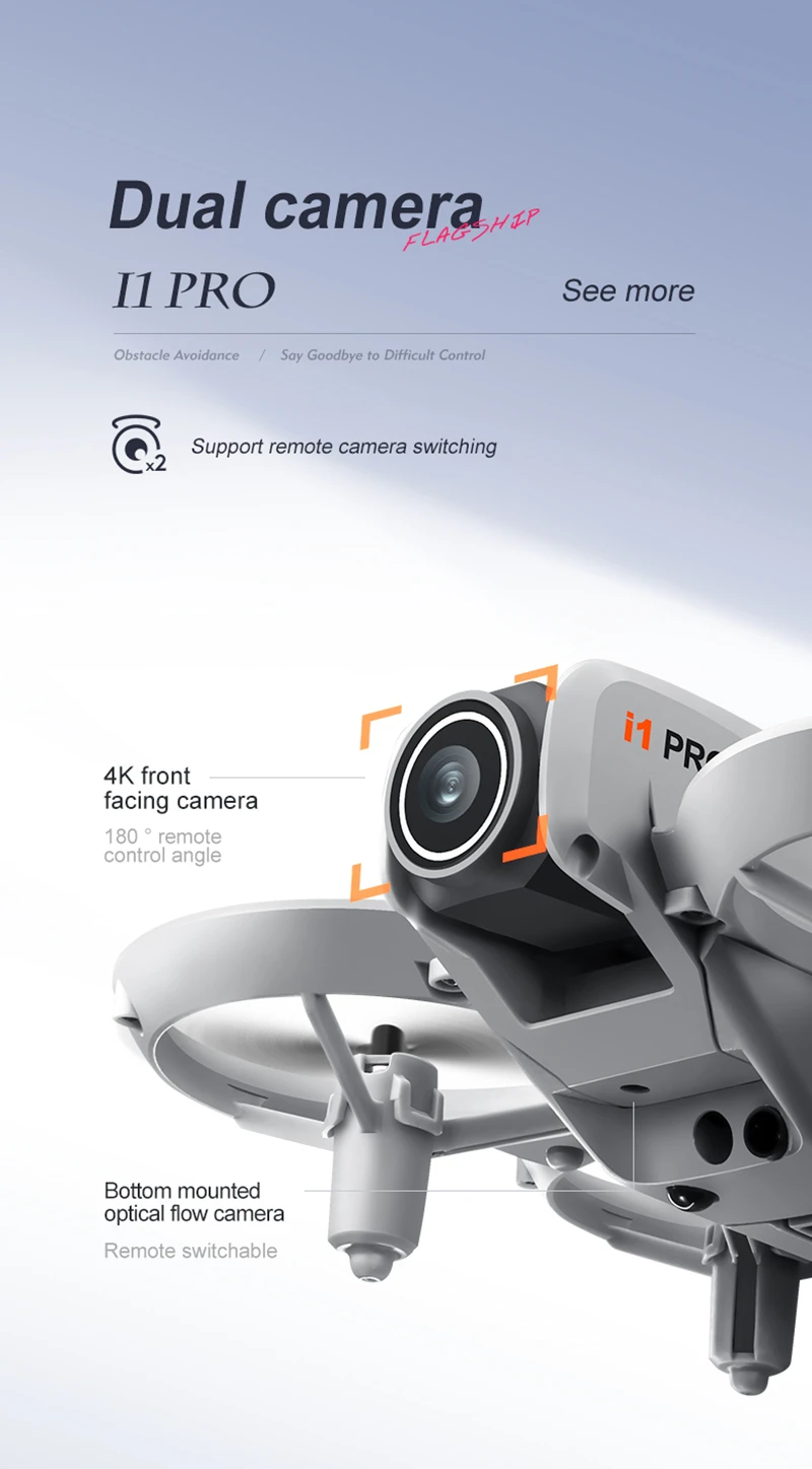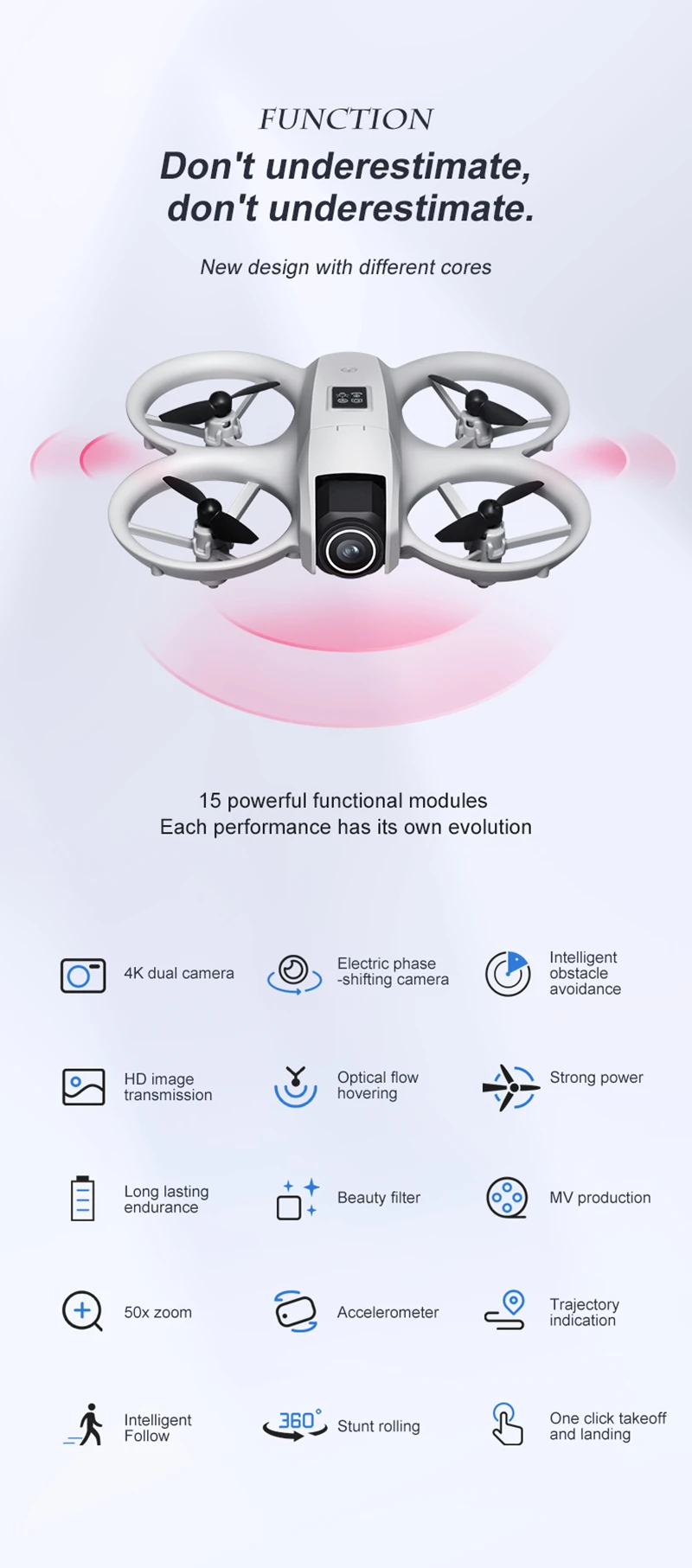 2: El dron tiene una función de modo de mantenimiento de altitud fija, evitación de obstáculos con detección de tres lados incorporada, lente ajustable eléctricamente y puede alcanzar 180° Disparo ascendente, posicionamiento de punto fijo de flujo óptico y vuelo estable.