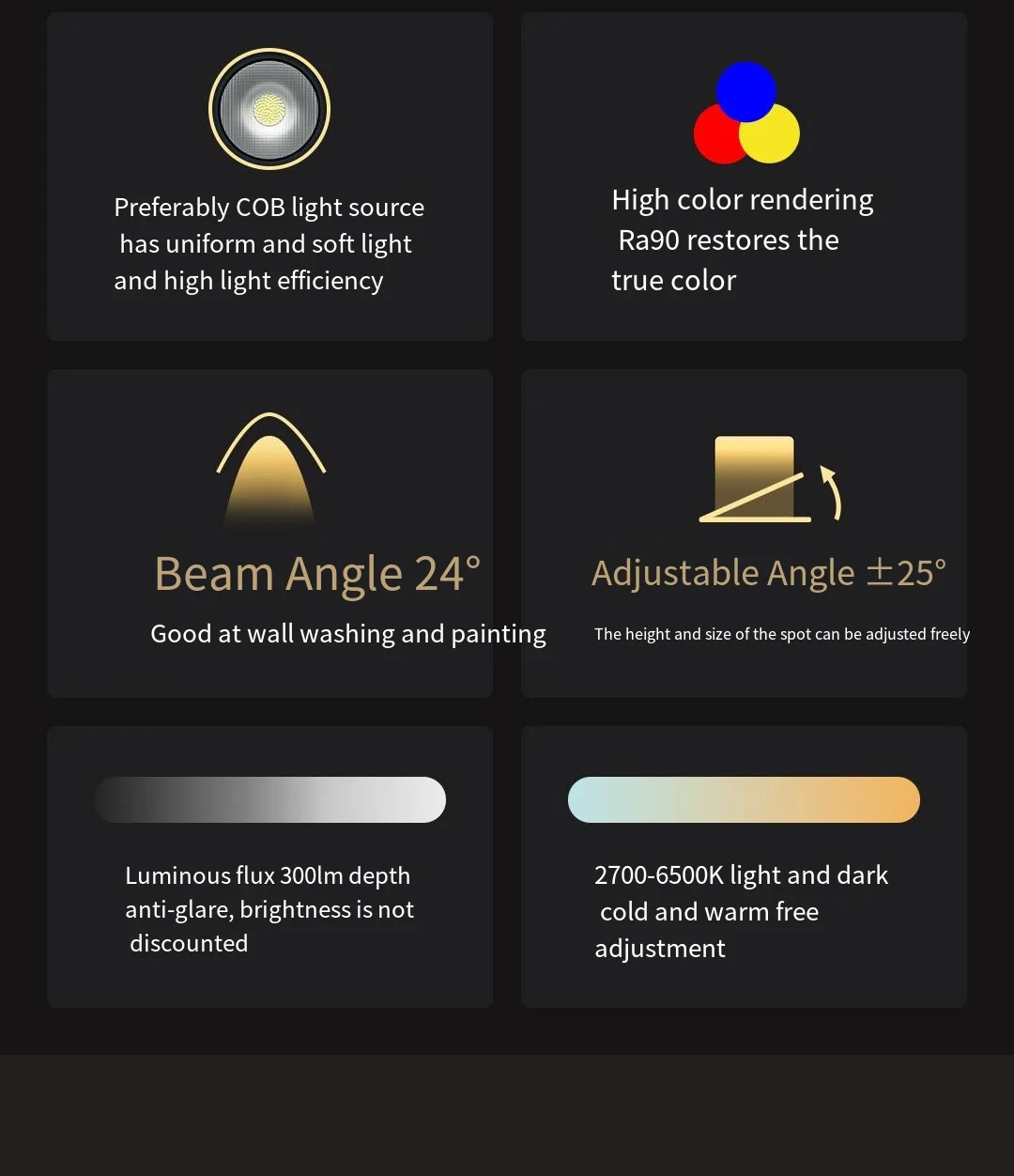 3. Temperatura de color ajustable (2700-6500K) y ángulo de haz (24°).