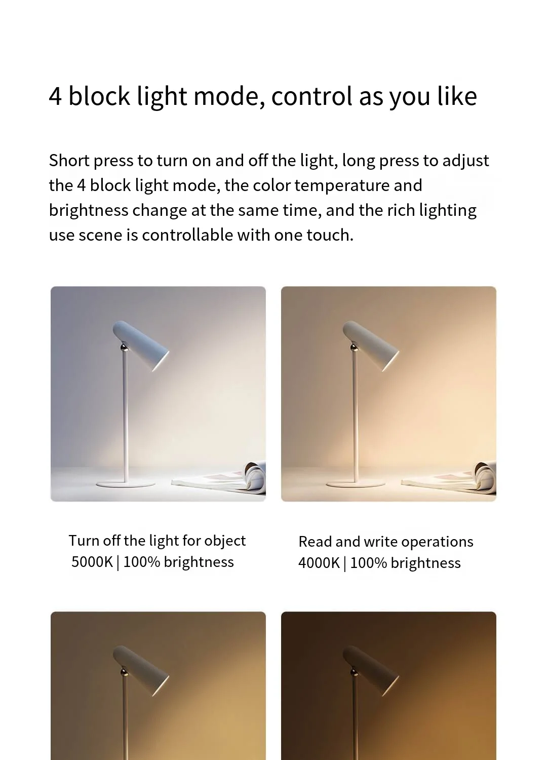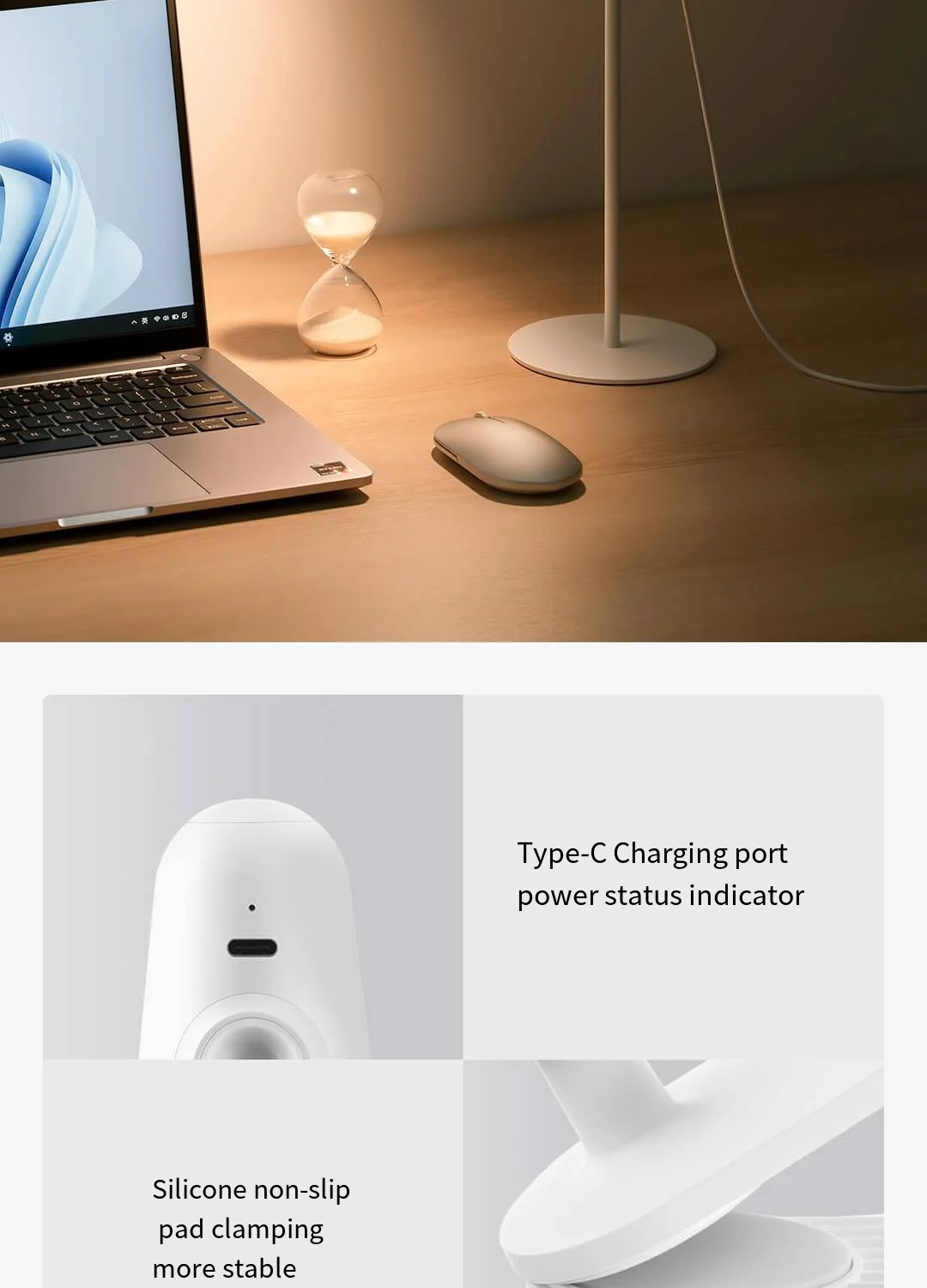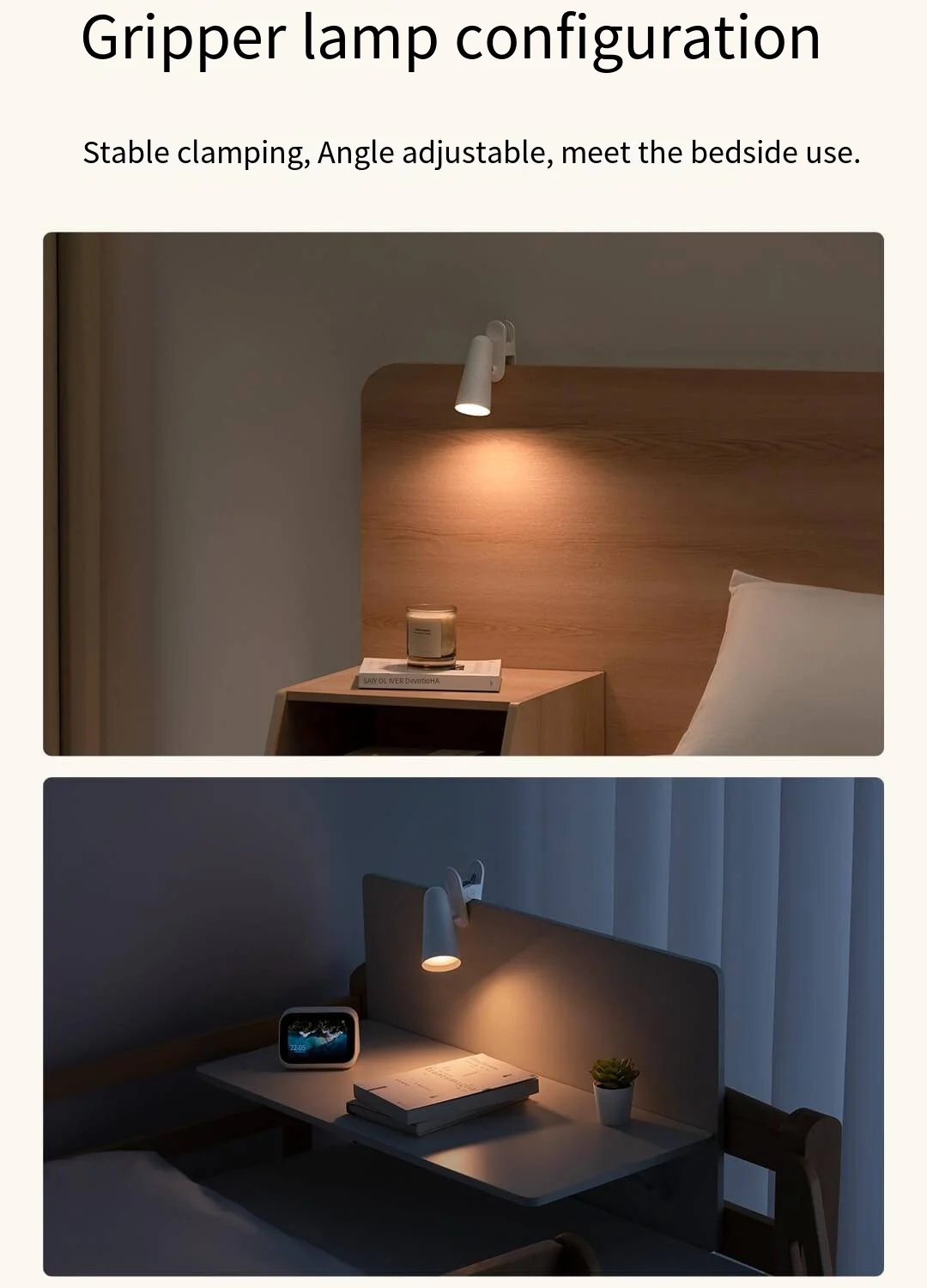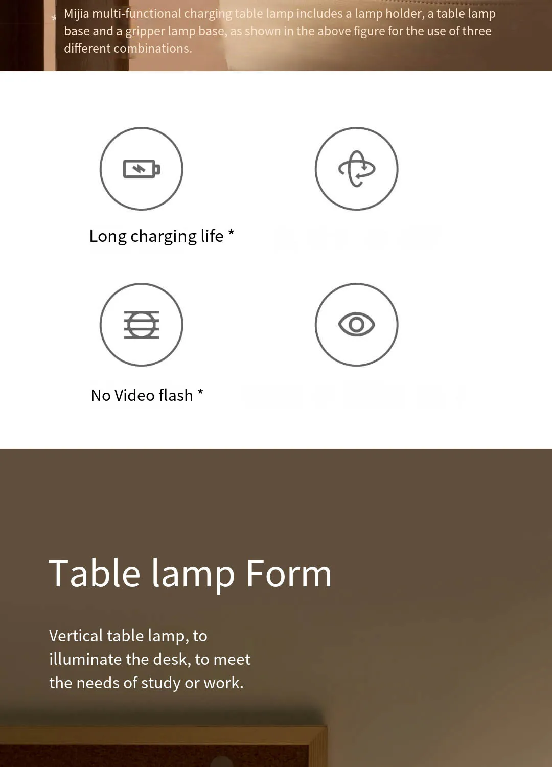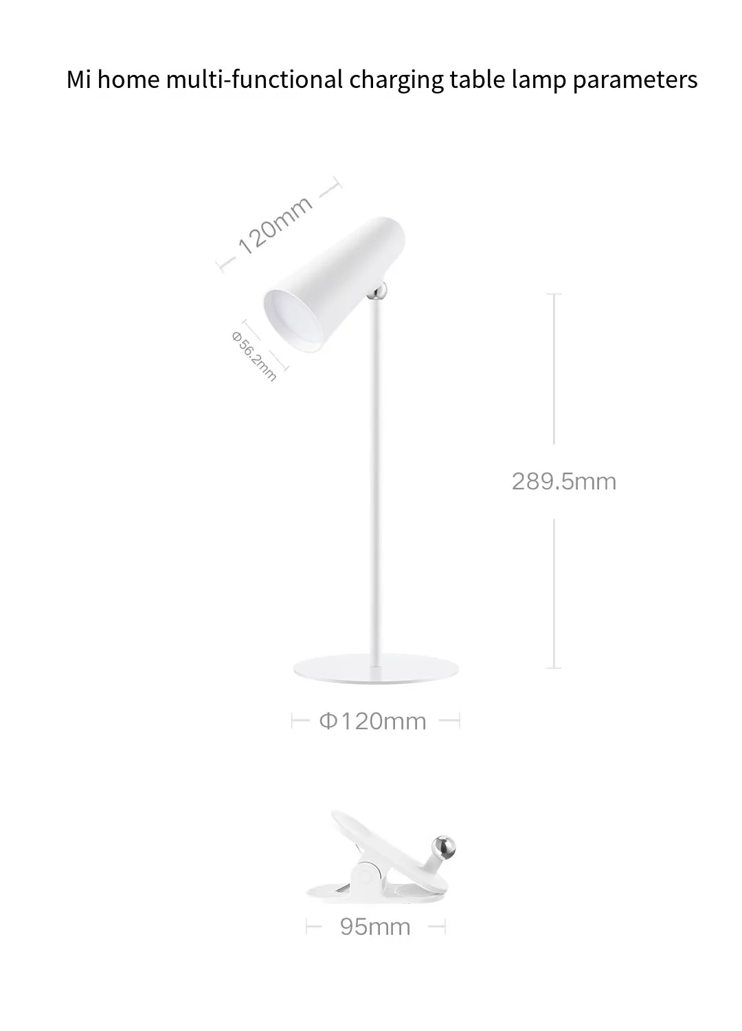 *The Mijia multifunctional rechargeable desk lamp includes a lamp holder, a desk lamp base, and a clamping lamp base. The figure shows three different combinations of usage scenarios.