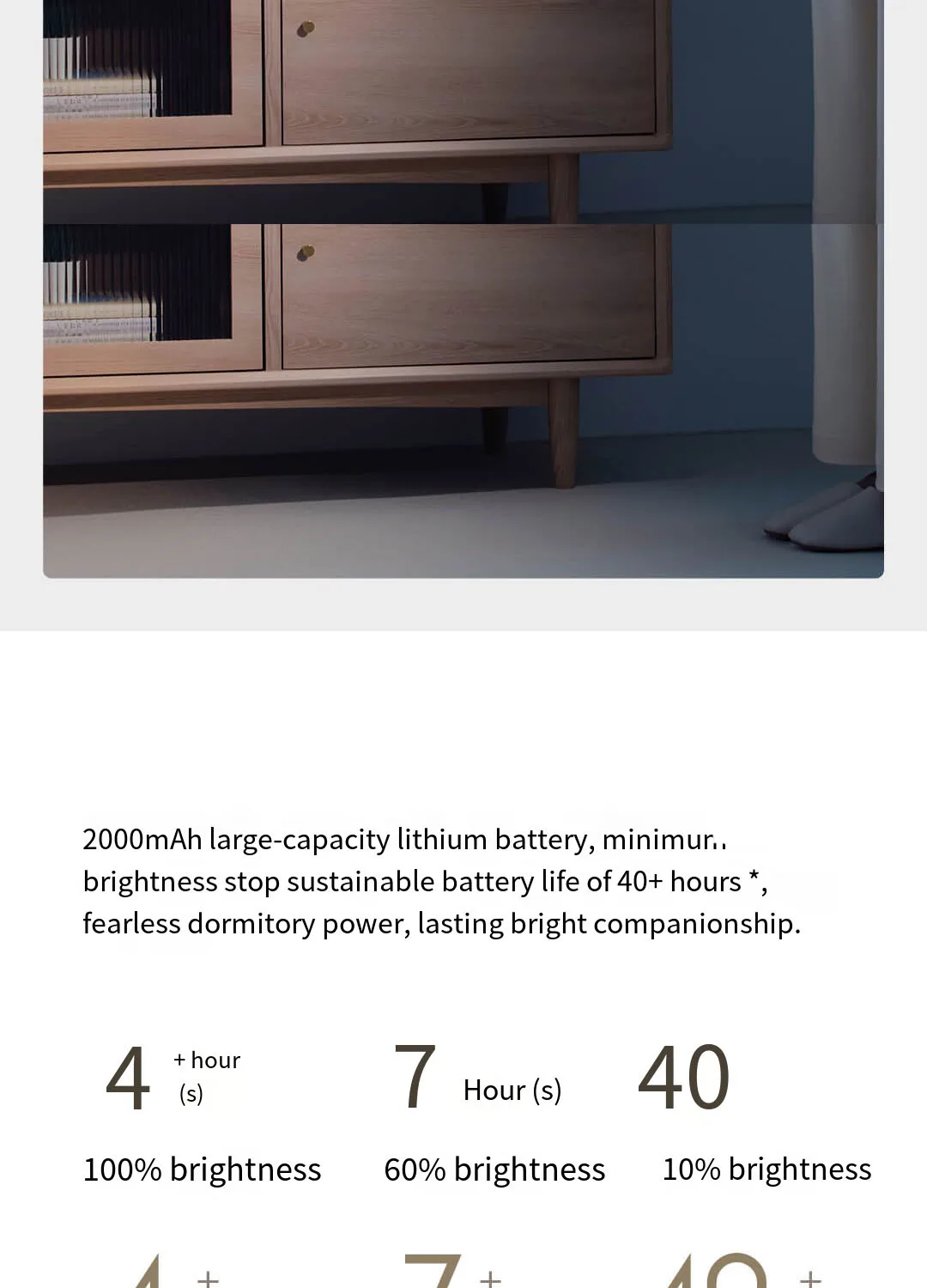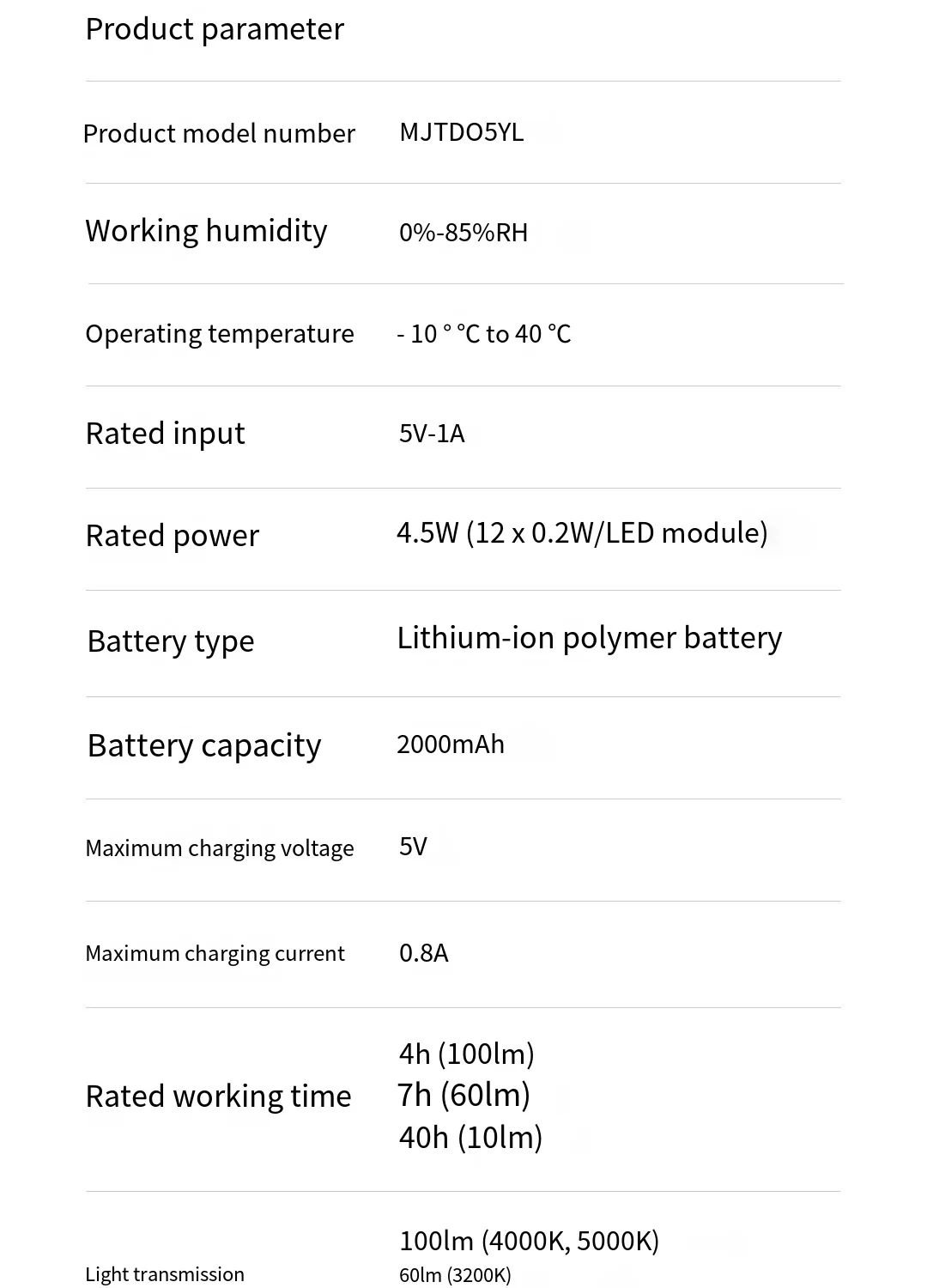 Rated working time: 4h (100lm), 7h (60lm), 40h (10lm)