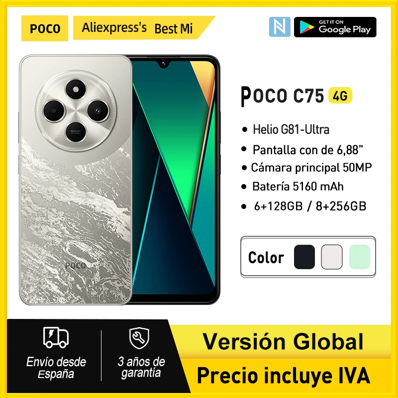 Comprar Xiaomi POCO C75 Versión Europea 128GB/256GB Helio G81-Ultra Triple CÁMARA DE 6,88 pulgadas, 120Hz, Batería 5160mAh NFC