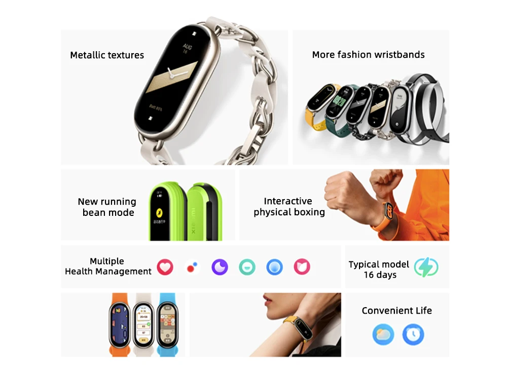 Texturas metálicas ④ Más Pulseras de Moda④ Nuevo Modo de Bean en funcionamiento④ Boxeo físico interactivo④ Gestión sanitaria múltiple④ Modelo típico de 16 días④ Vida útil