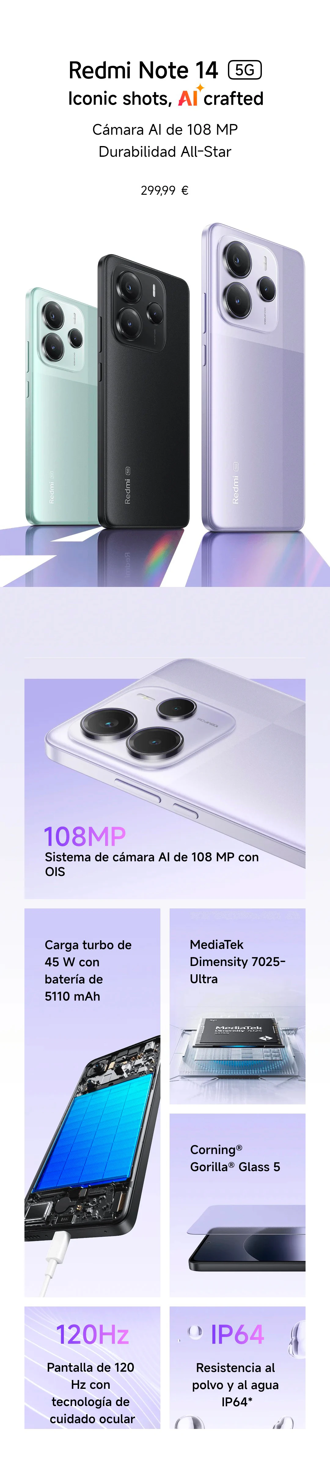 Comprar Xiaomi Redmi Note 14 5G NFC Versión Global 8+256GB Dimensity 7025-Ultra, Pantalla AMOLED 6,67", 120Hz, Cámara Principal 108MP OIS, 5110 mAh, IP64