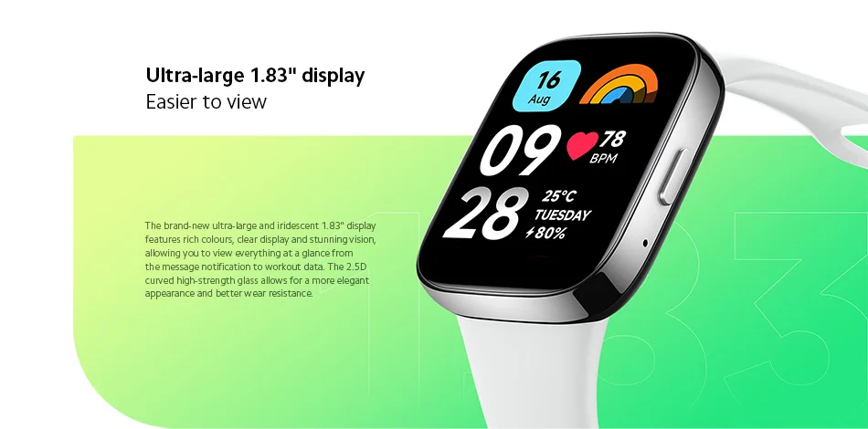 * Modo de uso intensivo Condiciones de prueba de 8 días para el Redmi Watch 3 Active: carga completa, configuración predeterminada de fábrica, monitoreo de frecuencia cardíaca cada 1 minuto, monitoreo de sueño de alta precisión activado, recibir y mostrar 200 mensajes de notificación por día, configurando 4 alarmas por día, Levantar la muñeca para iluminar la pantalla 200 veces al día, recibir 4 notificaciones de llamadas entrantes al día, 30 minutos de llamadas Bluetooth a la semana, 150 minutos de ejercicio a la semana, Y todas las demás configuraciones por defecto.