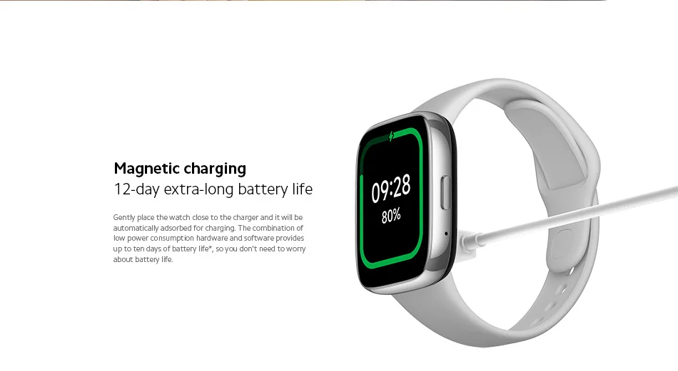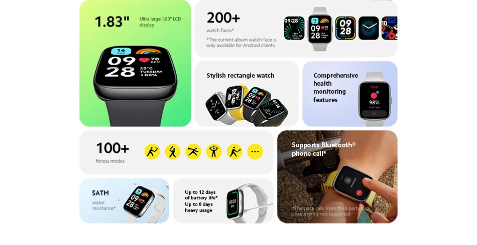 * Modo de uso típico: condiciones de prueba de 12 días para el Redmi Watch 3 Active: carga completa, configuración predeterminada de fábrica, monitoreo de frecuencia cardíaca cada 10 minutos, monitoreo de sueño de alta precisión apagado. recibir y mostrar 100 mensajes de notificación por día, configurando 3 alarmas por día, Levantando la muñeca para iluminar la pantalla 200 veces al día, recibiendo 2 notificaciones de llamadas entrantes al día, 15 minutos de llamadas Bluetooth a la semana, 90 minutos de ejercicio a la semana, Y todas las demás configuraciones por defecto.