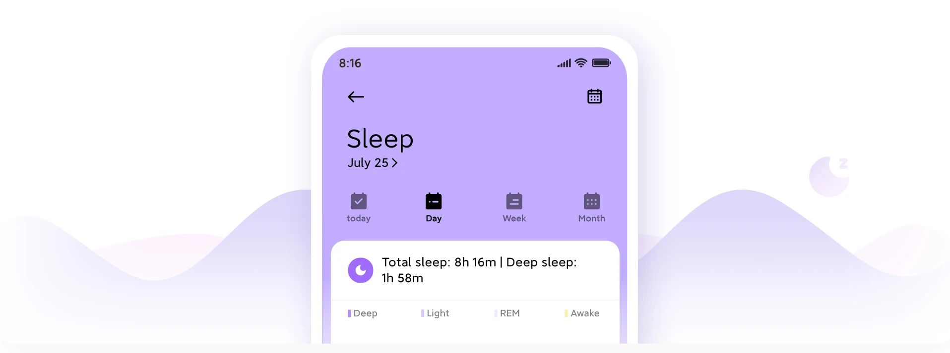 Monitoreo sueñoControla su sueño las 24 horas y proporciona informes detallados sobre el sueño profundo, el sueño ligero y las etapas REM * para ayudarle a averiguar lo que está sucediendo durante el sueño.* El sueño de menos de 20 minutos no se registra, y el sueño profundo de menos de 3 horas no se registra