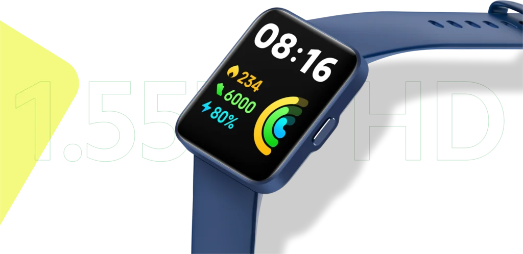 Pantalla táctil HD de 1,55"Alta resolución y colorido, se muestran más detalles. Ración pantalla-cuerpo más grande, 10% mayor que el modelo anterior Mi Watch Lite. Mejor experiencia de control visual y táctil.