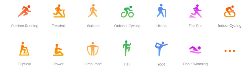 Más de 100 modos de entrenamientoControla tus ejercicios como un experto17 modos profesionales, incluyendo HIIT y Yoga para ayudarte a alcanzar tu objetivo de fitness que querías. 100 modos de entrenamiento extendidos que le ofrecerán más opciones.