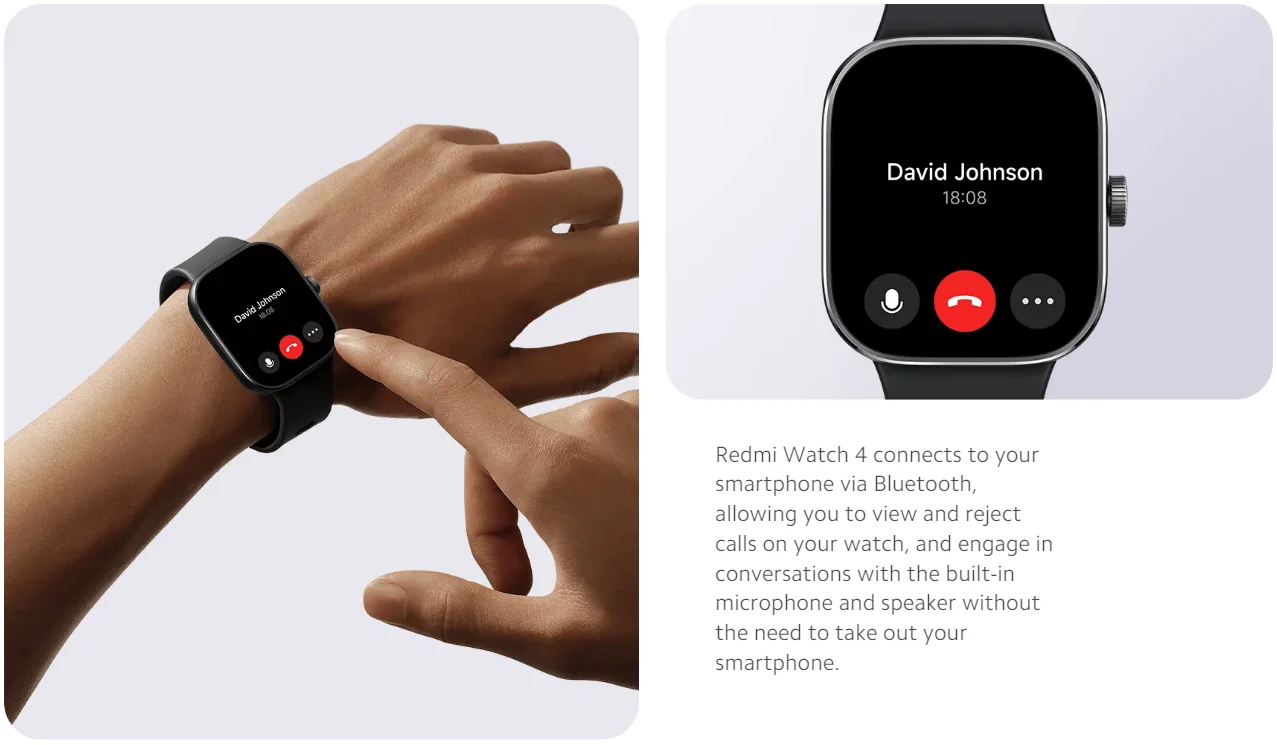 Redmi Watch 4 se conecta a su teléfono inteligente a través de Bluetooth, lo que le permite ver y rechazar llamadas en su reloj, y entabla conversaciones con el micrófono y el altavoz incorporados sin necesidad de sacar tu smartphone.