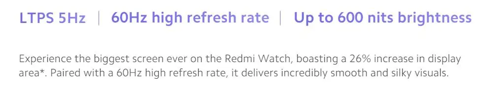 Experimente la pantalla más grande de la historia en el Redmi Watch, con un aumento del 26% en el área de visualización *. Junto con una alta frecuencia de actualización de 60Hz, ofrece imágenes increíblemente suaves y sedosas.