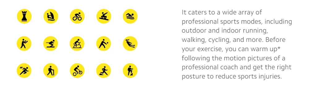 Se adapta a una amplia gama de modos deportivos profesionales, que incluyen correr al aire libre y en interiores, caminar, andar en bicicleta y más. Antes de su ejercicio, puede calentar * Siguiendo las imágenes en movimiento de un entrenador profesional y obtener la postura correcta para reducir las lesiones deportivas.