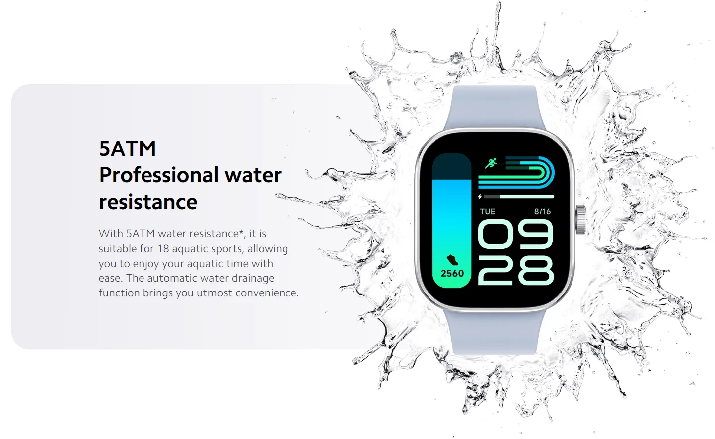 Con resistencia al agua de 5ATM *, es adecuado para 18 deportes acuáticos, lo que le permite disfrutar de su tiempo acuático con facilidad. La función de drenaje automático de agua le brinda la máxima comodidad.