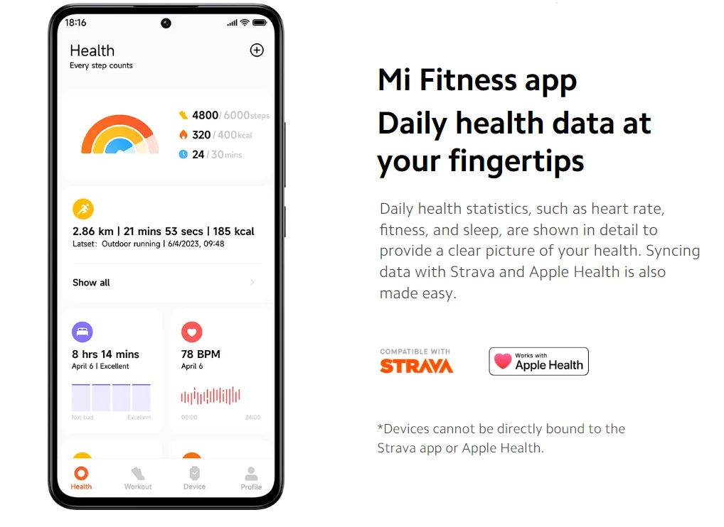 Las estadísticas diarias de salud, como la frecuencia cardíaca, el estado físico y el sueño, se muestran en detalle para proporcionar una imagen clara de su salud. La sincronización de datos con Strava y Apple Health también es fácil.
