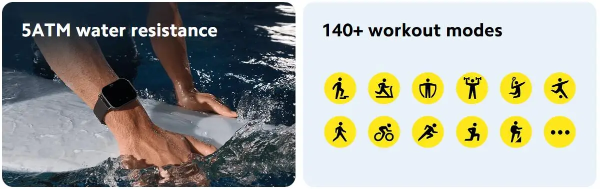 * La duración de la batería de 12 días con un uso intenso se probó con el reloj: completamente cargado; usando la configuración predeterminada de fábrica y un dial estático; monitoreo del sueño de alta precisión, monitoreo de la calidad de la respiración del sueño activado; detección diaria de frecuencia cardíaca y notificaciones de mensajes cada 11 minutos (200 mensajes, 4 llamadas y 4 alarmas al día) Encendido; muñeca levantada para activar la pantalla 200 veces al día; inicio manual de la aplicación para sincronizar datos dos veces al día; 30 minutos de llamadas Bluetooth cada semana; Y se usa para registrar el ejercicio durante 150 minutos cada semana.