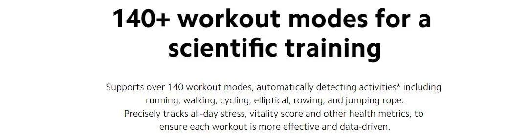Admite más de 140 modos de entrenamiento, detectando automáticamente actividades * como correr, caminar, andar en bicicleta, elíptica, remo y saltar la cuerda.