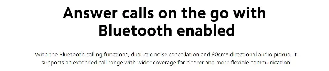 Con la función de llamada Bluetooth *, la cancelación de ruido de Micrófono dual y la captación de audio direccional de 80cm *, admite un rango de llamada extendido con una cobertura más amplia para una comunicación más clara y flexible.