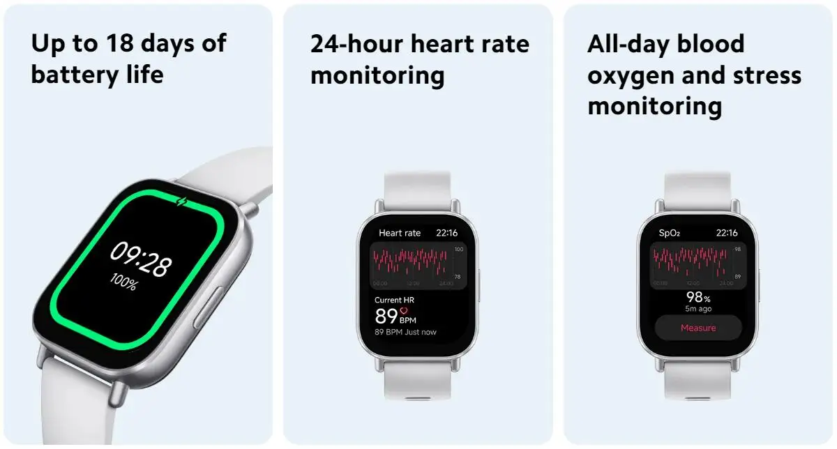 * La duración de la batería de 18 días en el uso típico se probó con el reloj: completamente cargado; usando la configuración predeterminada de fábrica y un dial estático; Monitoreo del sueño de alta precisión, monitoreo de la calidad de la respiración del sueño, monitoreo de estrés durante todo el día y monitoreo de oxígeno en sangre durante todo el día apagado; Detección diaria de frecuencia cardíaca cada 10 minutos y notificaciones de mensajes (100 mensajes, 2 llamadas y 3 alarmas al día activadas; muñeca levantada para activar la pantalla 200 veces al día; iniciar manualmente la aplicación para sincronizar datos una vez al día; 15 minutos de llamadas Bluetooth cada semana; y usarlo para grabar ejercicio durante 90 minutos cada semana.