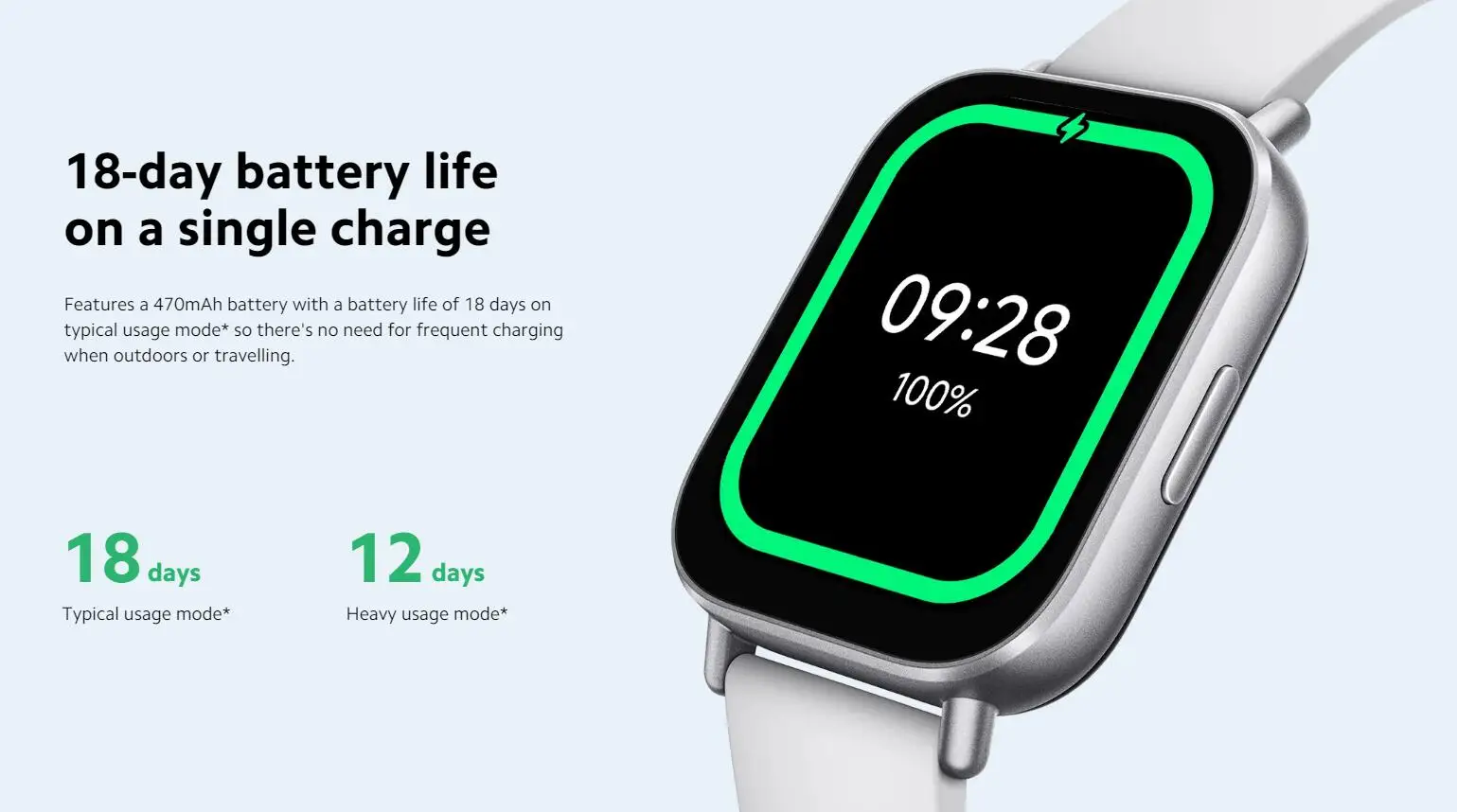 Cuenta con una batería de 470mAh con una duración de batería de 18 días en el modo de uso típico *, por lo que no es necesario cargarla con frecuencia cuando se está al aire libre o de viaje.