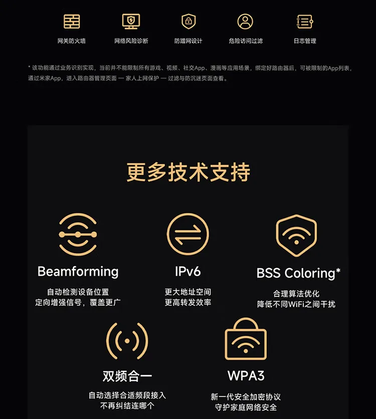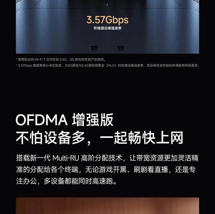 6453Mbps es la velocidad inalámbrica máxima teórica para las simultáneas de doble banda de 2,4GHz y 5GHz, pero la velocidad real puede variar debido a factores ambientales.Los datos comparativos provienen del laboratorio Xiaomi y los productos comparados son todos productos propios de Xiaomi.La experiencia real puede variar según el terminal y el entorno.Consulta la situación real.Configuración de hardwareNombre del producto: enrutador Xiaomi BE6500Procesador: CPU Qualcomm quad-core A53 de 1,1 GHzMemoria: 512 MBWi-Fi de 2,4 GHz: 2X2 (velocidad máxima teórica de hasta 688,2 Mbps)Wi-Fi de 5 GHz: 4X4 160 MHz (velocidad máxima teórica de hasta 5764,7 Mbps)Antena del producto: 6 antenas Wi-Fi externas de alta gananciaDisipación de calor del producto: disipación de calor natural.Interfaz general: 4 puertos WAN/LAN adaptables de 10/100/1000/2500 MLuz indicadora --1Botón de reinicio del sistema --1Puerto de alimentación --1Teclas de malla --1Estándares de protocolo -IEEE 802.11a/b/g/n/ac/ax/be, IEEE 802.3/3u/3ab/3bz