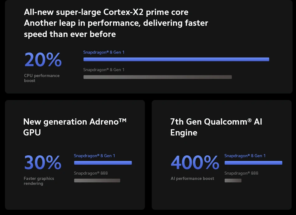 CPU------------- CPU Snapdragon 8 Gen 1 Octa Core, proceso de fabricación de 4nm de bajo consumo, hasta 3,0 GHz