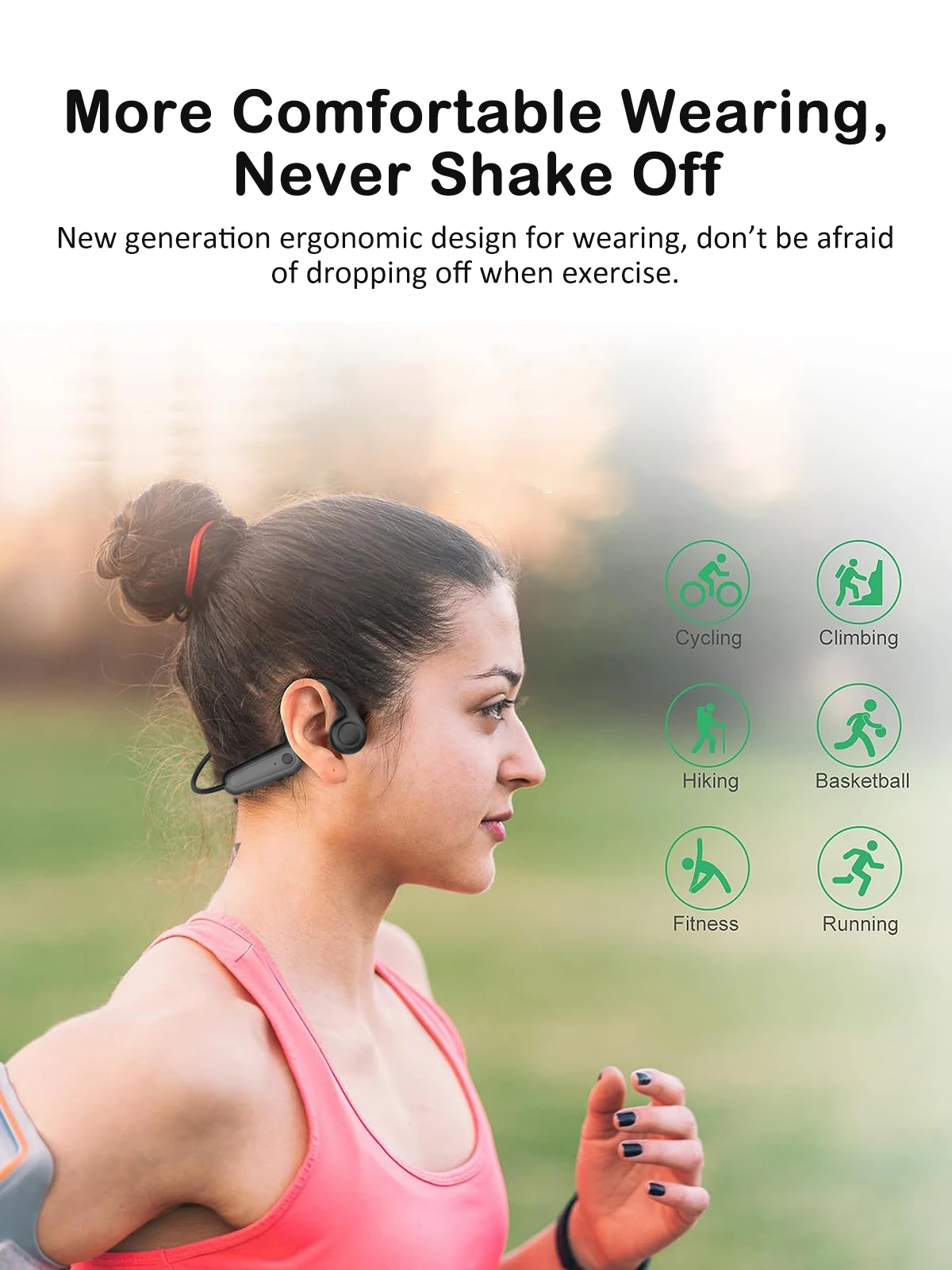 —New generation ergonomic design for wearing, don’t be afraid of dropping off when exercise.