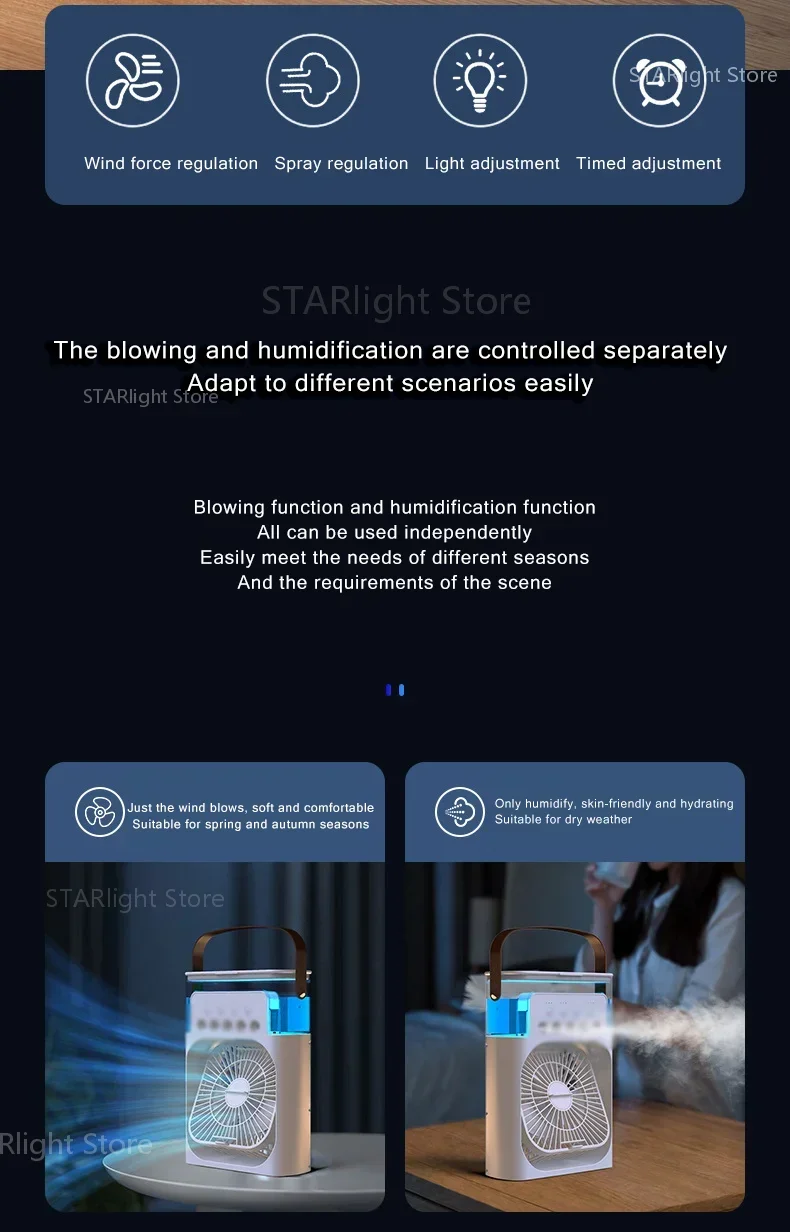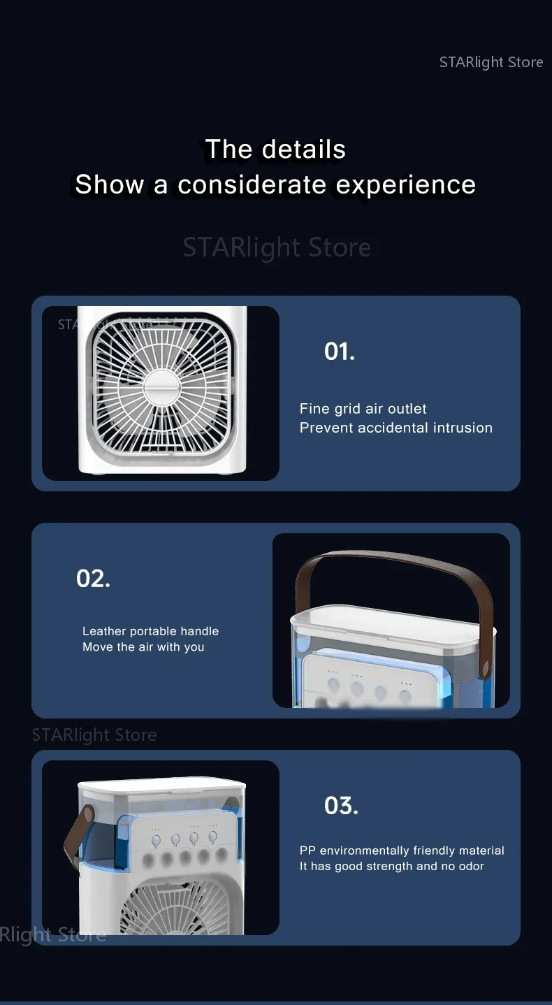 * 3-in-1 function: includes functions of fan, air conditioner and air humidifier. If you feel the air is dry and hot, buy it. It is not only a personal air conditioner but also an air humidifier. In hot summer, when you add ice cubes and water to the sink, you will feel the cool air and enjoy the cool summer. At the same time, it can also humidify the air in autumn and winter.