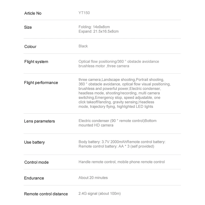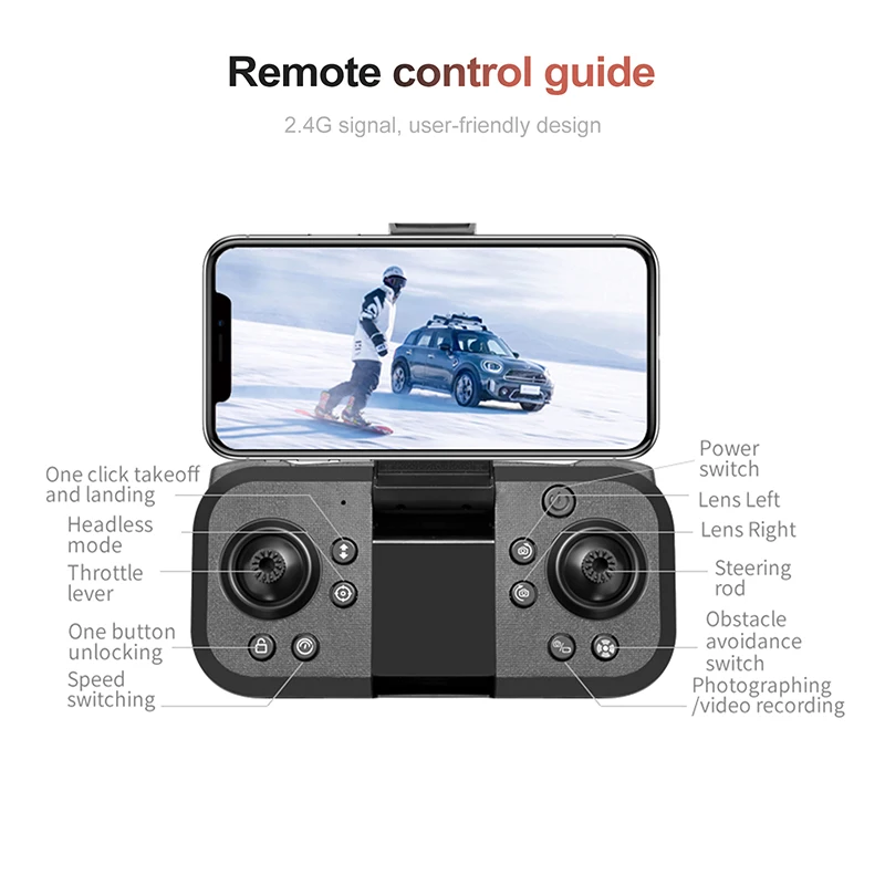 Modo de retención de altura, despegue/aterrizaje con una sola tecla, subida y bajada, avance y retroceso, vuelo lateral izquierdo y derecho, dirección, modo sin cabeza (características de la cámara: fotografía gestosa, vídeo, sin cabeza)