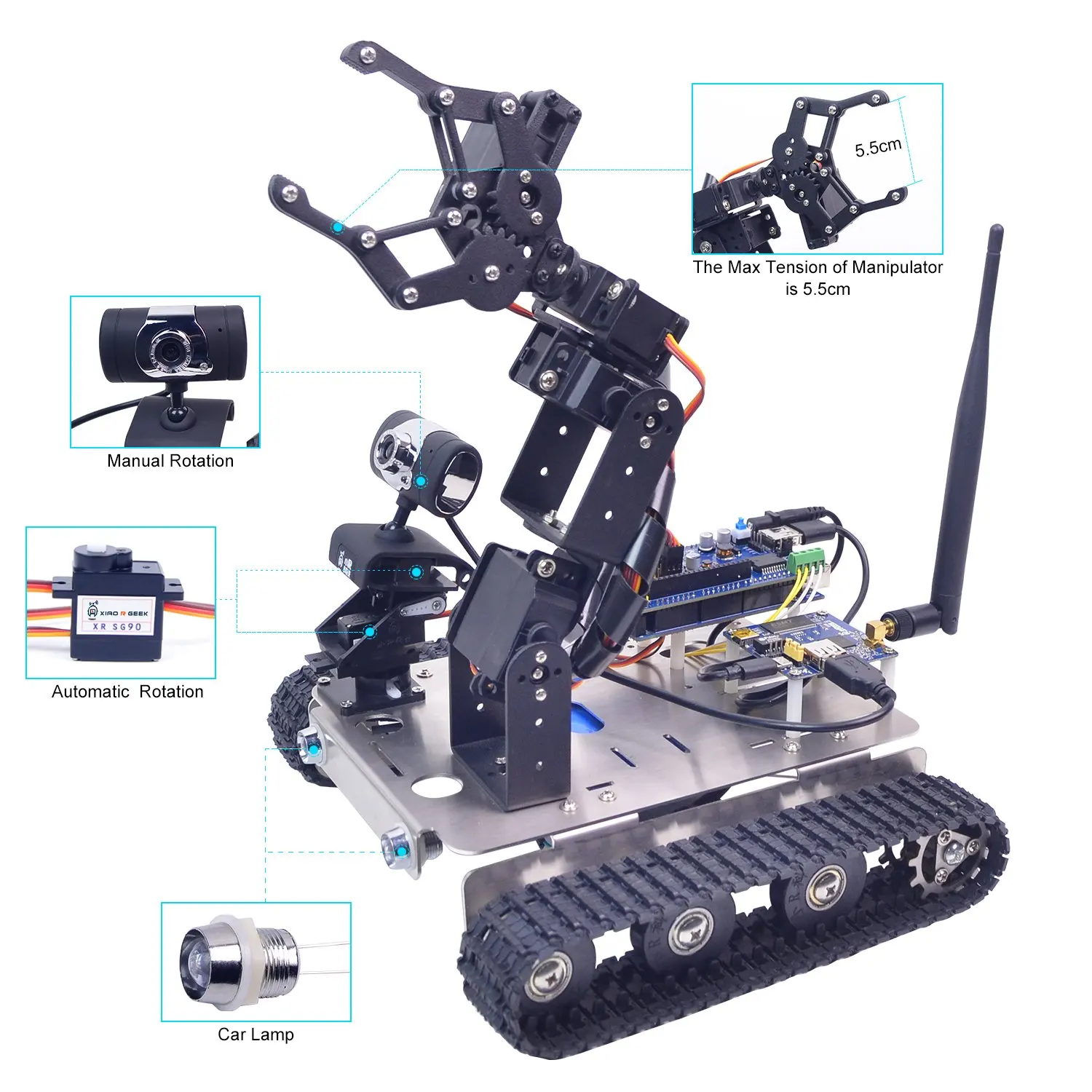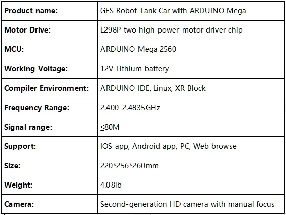 item value Battery Operated Toy, Educational Toy, Electronic Toy Material Metal proportion 1:5 Place of Origin China Province Guangdong Brand Name XiaoR Geek or OEM Product Name GFS Robot Tank Car with ARDUINO Mega Type Educational DIY Robot Feature Multi-function Learning Machine Funciton Programming Interactive Intelligent Robot Car Battery 12V 2200mah Selling point Intelligent Development