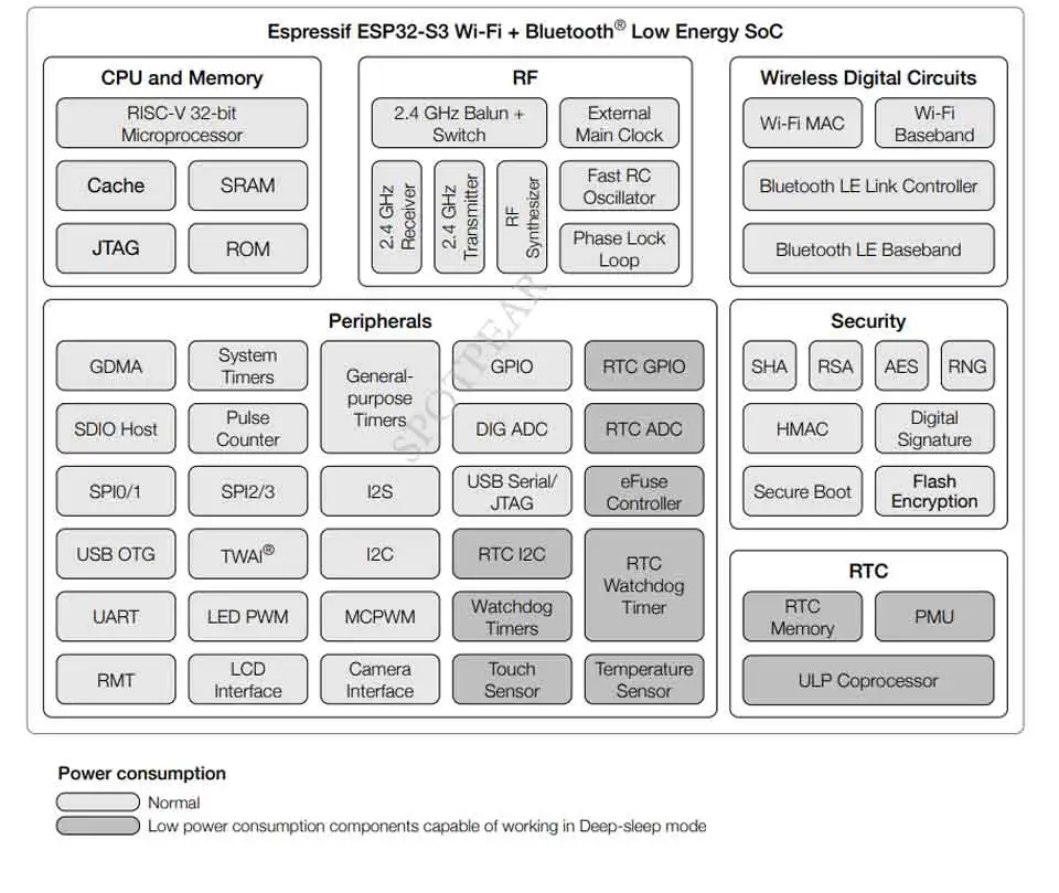 ESP32-S3 tiene 45 GPIO programables e interfaces periféricas comunes como SPI, I2S, I2C, PWM, RMT, ADC, UART, controlador de host SD/MMC y controlador TwAITM.14 de los GPIO se pueden configurar como entradas táctiles capacitivas para la interacción HMI.Además, ESP32-S3 está equipado con un coprocesador (ULP) de consumo ultrabajo, que admite múltiples modos de bajo consumo y se usa ampliamente en diversos escenarios de aplicaciones de bajo consumo.
