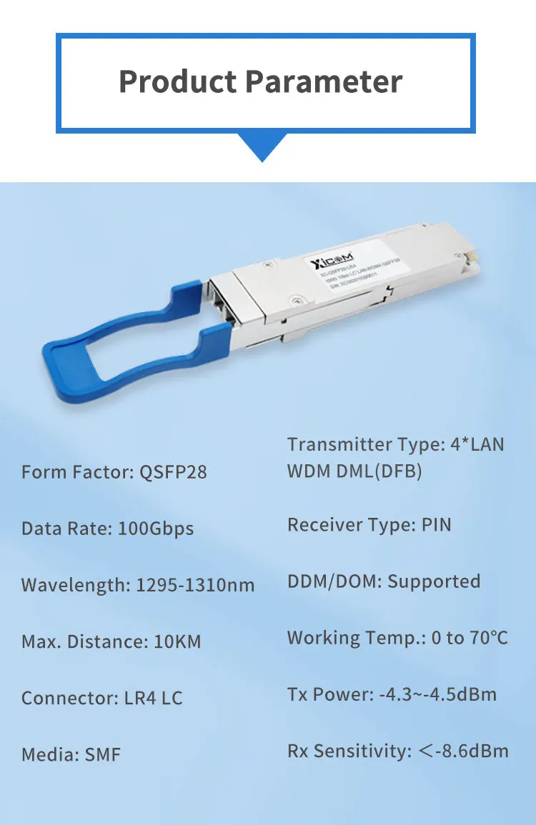Xicom QSFP28-100G 1310nm 10Km LC DDM SFP Módulo LC Módulo óptico dúplex de modo únicoCompatible con Cisco QSFP-100G-LR4-S