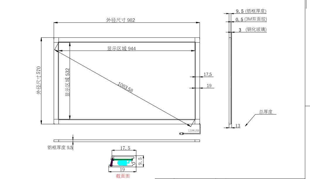 43 pulgadas 20 puntos IR/panel de pantalla multitáctil infrarroja Dibujo de dimensiones del producto: