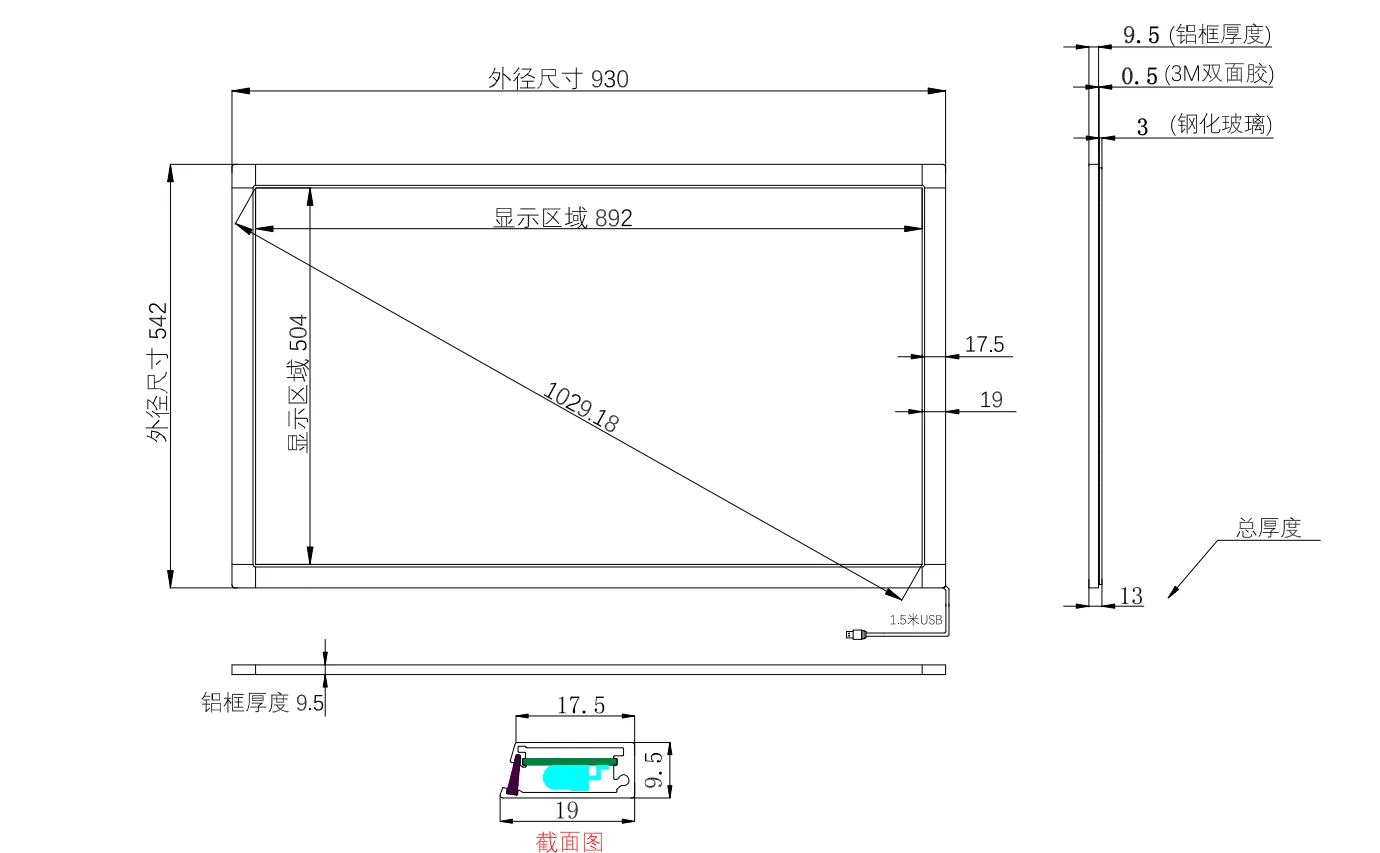 40 pulgadas 20 puntos IR/Infrared Multi Touch Screen Product Dimension Drawing: