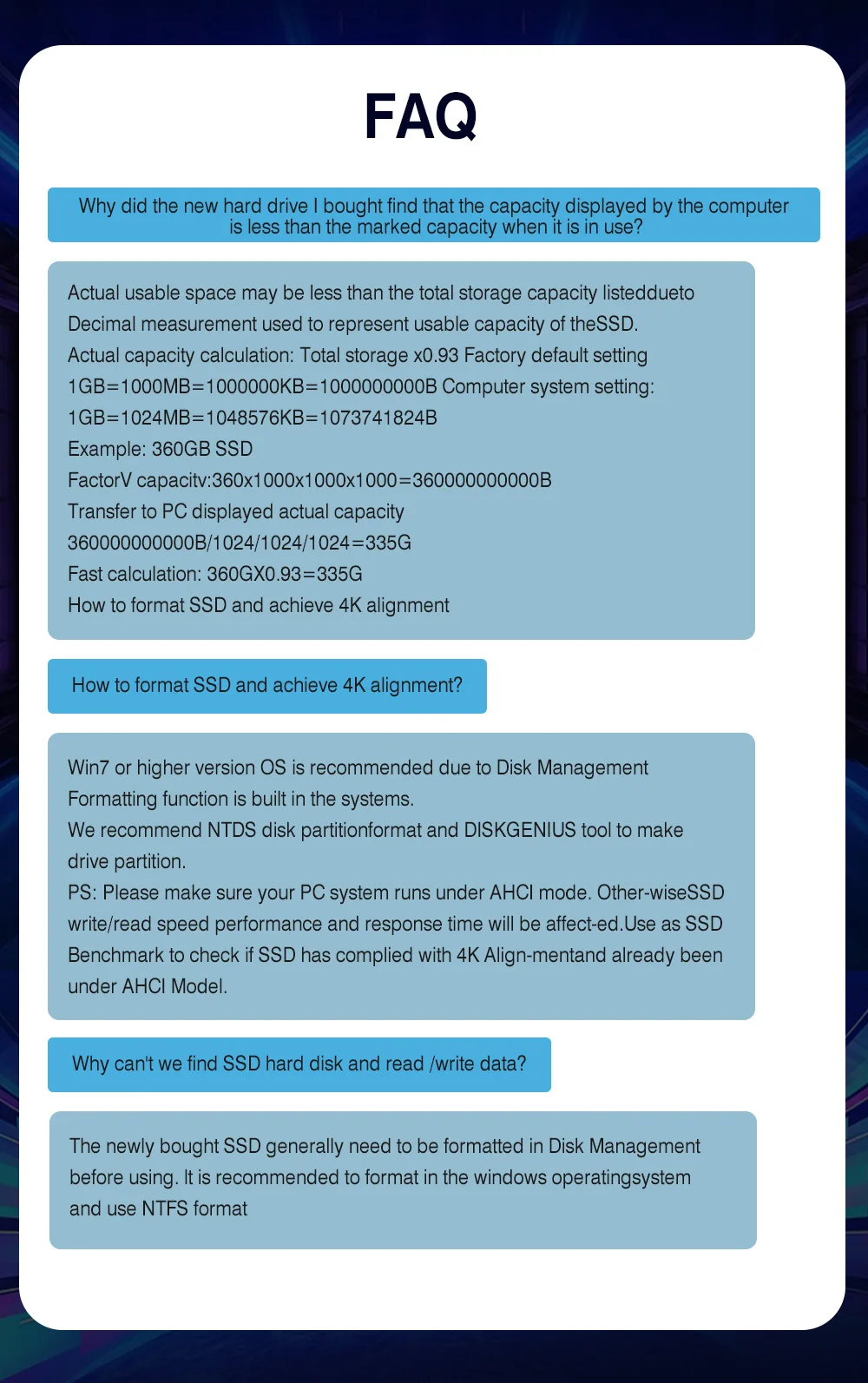 Somos fabricantes de disco duro SSD interno/Unidad SSD/unidad de estado sólido/SSD portátil/disco de estado sólido que incluye 2,5 pulgadas SATA, M.2 2280/2242, mSATA y NVME durante más de 15 años. Este producto se utiliza para ordenador portátil, ordenador de sobremesa, portátil, ordenador todo en uno, máquina POS, máquina de enseñanza, servidor, etc. Y la capacidad podría ser 32G/60G/64G/120G/128G/240G/256G/480G/512G/960GB/1TB/2TB./4TB.