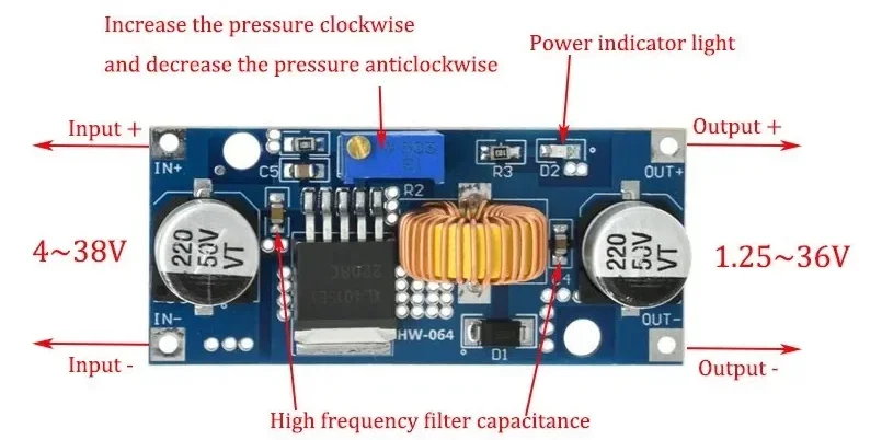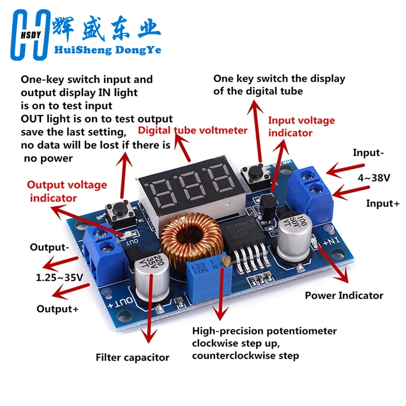 Módulo reductor ajustable 5A DC-DC con voltímetroUno: Descripción del productoEste producto es un módulo DC/DC reductor PWM (reductor) de frecuencia fija de 180 KHz, capaz de controlar una carga de 5 A con alta eficiencia, baja ondulación y excelente regulación de línea y carga.El módulo con un medidor de voltaje muestra el voltaje de entrada y el voltaje de salida, y el voltaje se puede corregir a través del botón para mejorar la precisión del voltímetro.Características:1.Indicador de alimentación LED.2.Botón para cambiar la medición del voltaje de entrada o salida, y el LED indica la medición actual del voltaje de entrada o salida; El tubo nixie se puede apagar mediante otro botón.Los estados mencionados se pueden memorizar y no se pierden incluso si se desconecta la alimentación.(El LED "IN" marcado a bordo está encendido, el valor del voltaje de entrada de la pantalla del tubo nixie, la pantalla brillante del LED "OUT" es el valor del voltaje de salida).3.¡Lanzamiento especial, la función de calibración del voltímetro, nunca existirá un voltímetro inexacto!Método de calibración del voltímetro:(1) Pasos de calibración del voltaje de salidaPaso 1, ajuste el botón derecho para que el LED "OUT" se encienda, el voltímetro muestre el valor del voltaje de salida;Presione el botón derecho durante más de 2 segundos, suéltelo, el voltímetro y el LED "OUT" parpadean en sincronización para ingresar al modo de calibración del voltaje de salida.Paso 2, presione el botón derecho (velocidad normal), el valor de voltaje suma una unidad;Presione el botón izquierdo, menos una unidad;Debido a que una unidad es inferior a 0.1V, la visualización del voltaje mínimo a 0.1 V, por lo que debe presionar continuamente de 1 a 5 veces para ver que el voltímetro cambie 0.1V, cuántas veces el voltímetro cambia 0.1V presionando la tecla, dependiendo del voltaje de visualización actual, cuanto mayor sea el voltaje, menor será el número de pulsaciones.Paso 3, presione el botón derecho durante más de 2 segundos, suelte para salir del modo de calibración del voltaje de salida.Todos los parámetros configurados para apagar automáticamente para guardar.(2) Pasos de calibración del voltaje de entradaPaso 1, ajuste el botón derecho para que el LED "IN" se encienda, el voltímetro muestre el valor del voltaje de entrada;presione el botón derecho durante más de 2 segundos, suelte, el voltímetro y el LED "IN" parpadean en sincronización para ingresar al modo de calibración de voltaje de entrada.Pasos 2 y 3, consistentes con el método de calibración del voltaje de salida.Dos: Parámetros de rendimiento1. Rango de voltaje de entrada: 4 ~ 38 VCC (Nota: voltaje de entrada que no exceda los 38 V)2. Rango de voltaje de salida: 1,25-36 VCC ajustable3.Corriente de salida: 0-5A4.Potencia de salida: 75W5.Rango del voltímetro: 4 a 40 V, error ±0,1 V6.Frecuencia de funcionamiento: 180KHz7.Alta eficiencia hasta 96%8. Función de apagado térmico integrada9.Función de límite de corriente integrada10. Función de protección contra cortocircuitos de salida integrada11.Protección de polaridad inversa de entrada: Ninguna (si es necesario, diodo de alta corriente en serie con la entrada).12.Largo x Ancho x Alto=6,6*3,9*1,8 CMTres: aplicaciónEl módulo reductor CC/CC aplica que el voltaje de entrada es mayor que el voltaje de salida del campo reductor, como batería, transformador de potencia, fuente de alimentación regulada ajustable de bricolaje, monitor LCD y TV LCD, fuente de alimentación de instrumentos portátiles, equipos de telecomunicaciones/redes, Fuente de alimentación para portátiles de vehículos de 24 V, reductor de equipos industriales. Buck de 12 V a 3. 3V, 12V buck a 5V, 24V buck a 5V, 24V buck a 12V, 36V buck a 24V, etc.