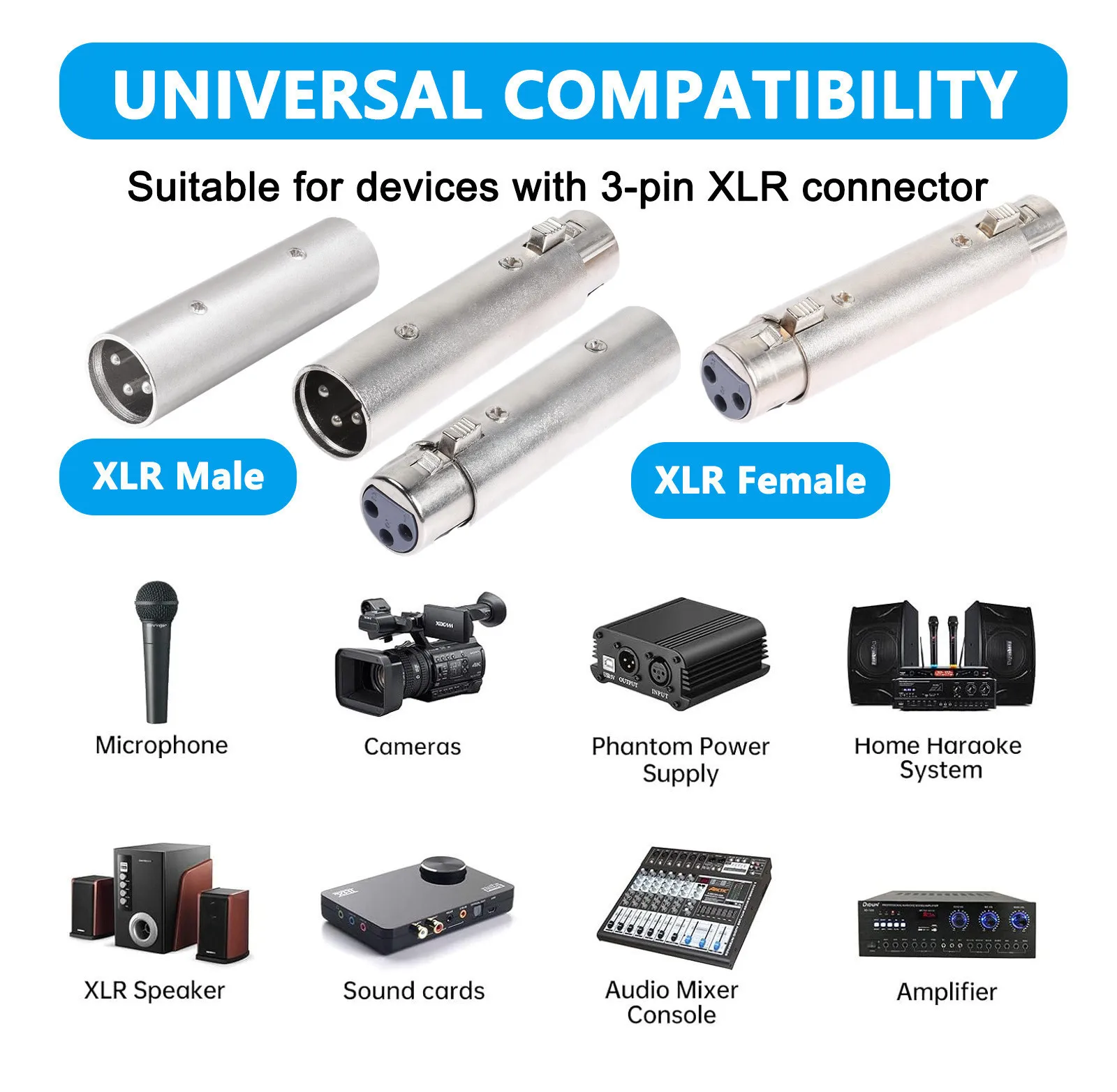Rango de aplicación: Adaptador Canon de tres núcleos macho a macho. Adecuado para micrófonos, equipos de audio, mezcladores y equipos periféricos para conectar señales de audio.