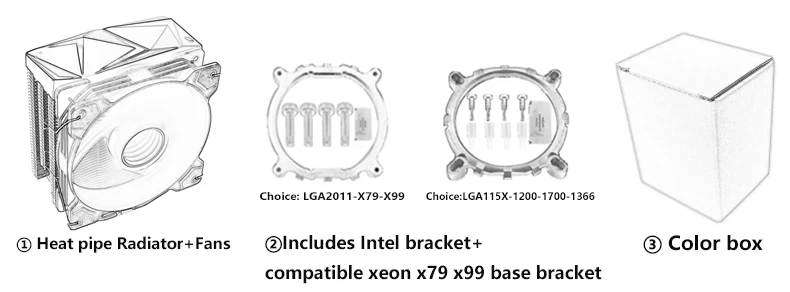 Paquete: Caja de color (refrigerador de CPU*1, incluye 1 juego de soporte de base Intel y tornillos, soporte de base Xeon-x79x99 + tornillos * 1 juego, grasa de silicona*2)