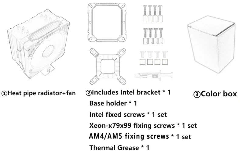 Paquete: Caja de color (refrigerador de CPU*1, incluye soporte Intel * 1, soporte de base * 1, tornillos fijos Intel * 1 juego, tornillos de fijación Xeon-x79x99 * 1 juego, tornillos de fijación AM4/AM5 * 1 juego, grasa térmica * 1)