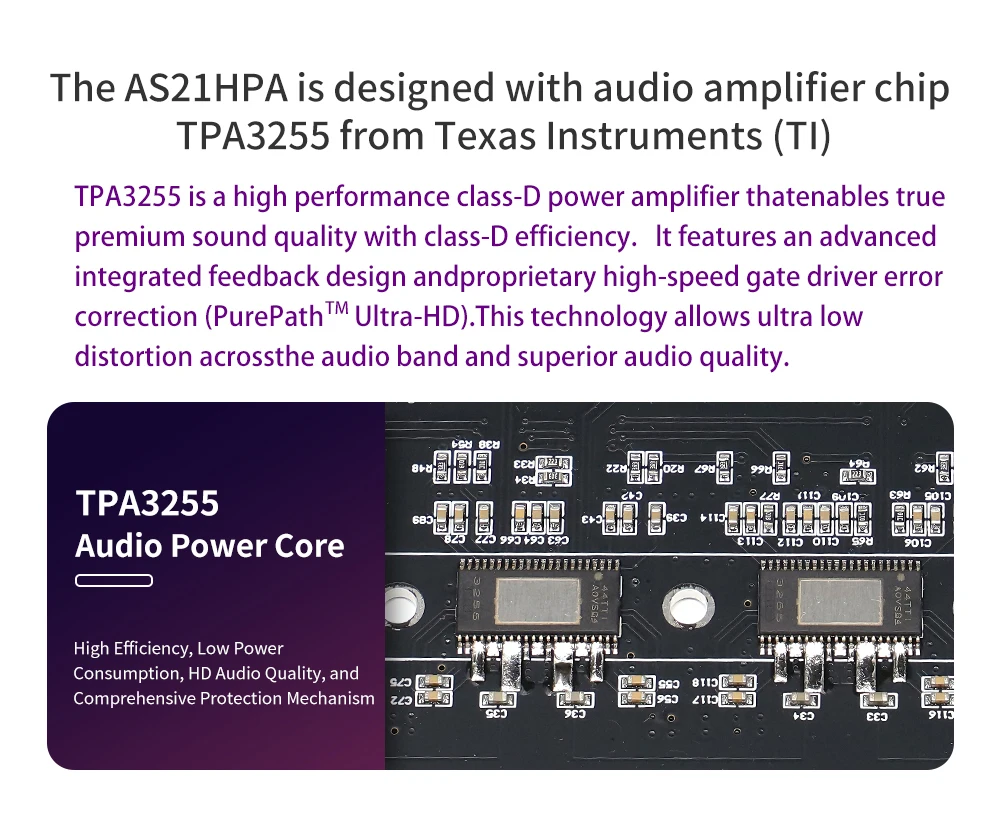 Este modelo está diseñado con 2 chips amplificadores TPA3255 originales importados, con núcleos duales para una mayor estabilidad.TPA3255 es un amplificador de potencia de clase D de alto rendimiento que tiene eficiencia de clase D y puede ofrecer una calidad de sonido verdaderamente alta.El dispositivo presenta un diseño de retroalimentación integrado avanzado y una función patentada de corrección de errores del controlador de puerta de alta velocidad (PurePath HD).Esta tecnología permite que los dispositivos mantengan una distorsión ultrabaja en toda la banda de frecuencia de audio mientras muestran una calidad de sonido de alta definición.