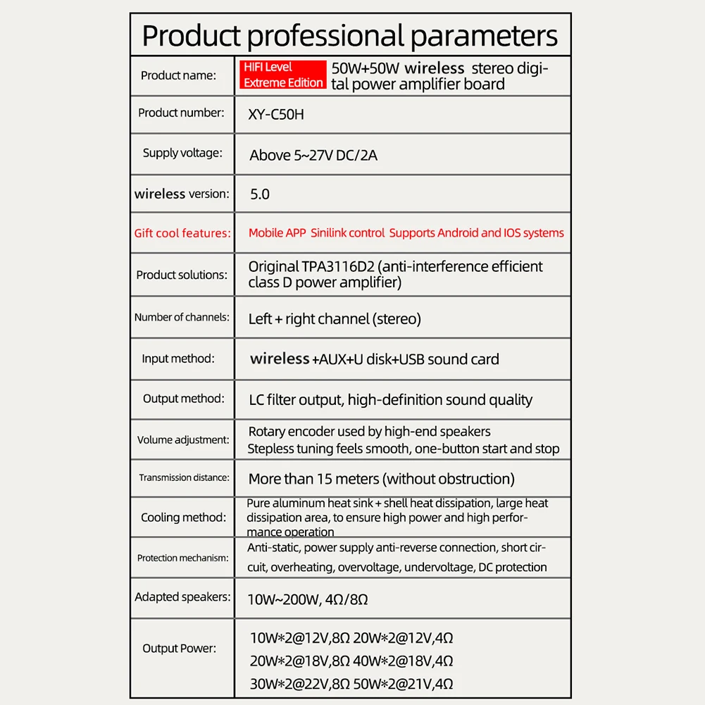 Este producto adopta el TPA3116D2 importado original, con alta relación de supresión de potencia, alta supresión de AM, alta eficiencia de conversión de potencia, placa de circuito de alta calidad y componentes electrónicos de marcas grandes.El diseño es razonable, lo que puede reducir eficazmente la interferencia electromagnética, aprovechar al máximo el área efectiva de disipación de calor y mejorar en gran medida el rendimiento del producto.Es ampliamente utilizado y rentable.Es un amplificador de potencia compatible con Bluetooth de alta potencia y alta calidad especialmente proporcionado para música de fiebre HiFi.