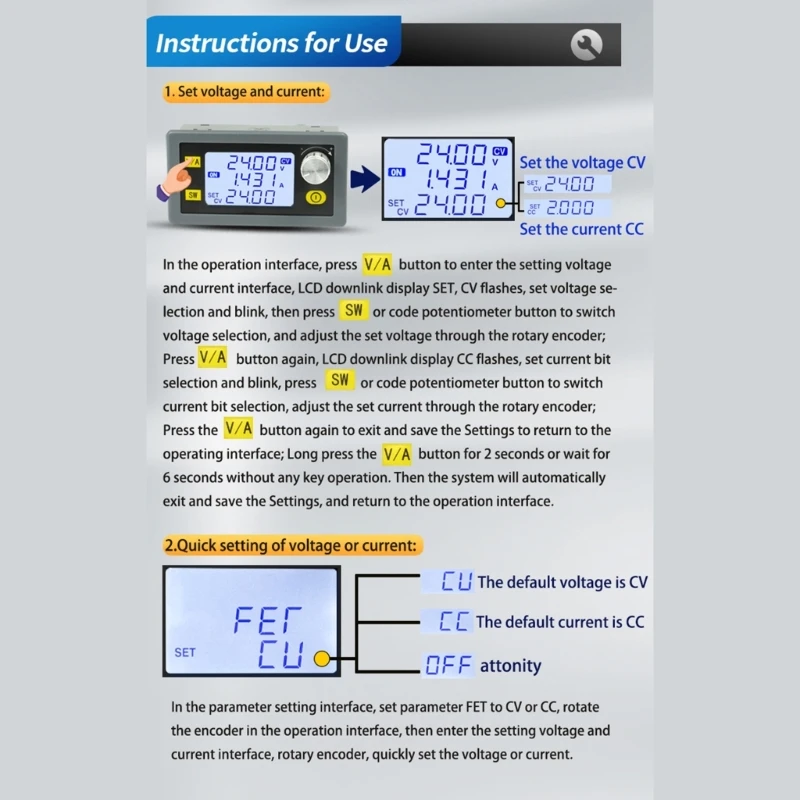 (2) establecer el valor de corriente constante (valor de protección contra sobrecorriente);(por ejemplo, si el valor de corriente constante es 3.00A, la corriente máxima solo puede alcanzar 3A cuando usa el producto, y cuando la corriente alcanza 3A, la pantalla LCD mostrará el estado "CC", de lo contrario la pantalla LCD mostrará el estado "CV")