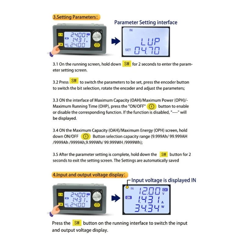Mantenga presionado el botón de configuración durante 5 segundos para bloquear el voltaje y la corriente establecidos y evitar un mal funcionamiento.Después de bloquear, mantenga presionada la tecla set durante 5 segundos para desbloquear.