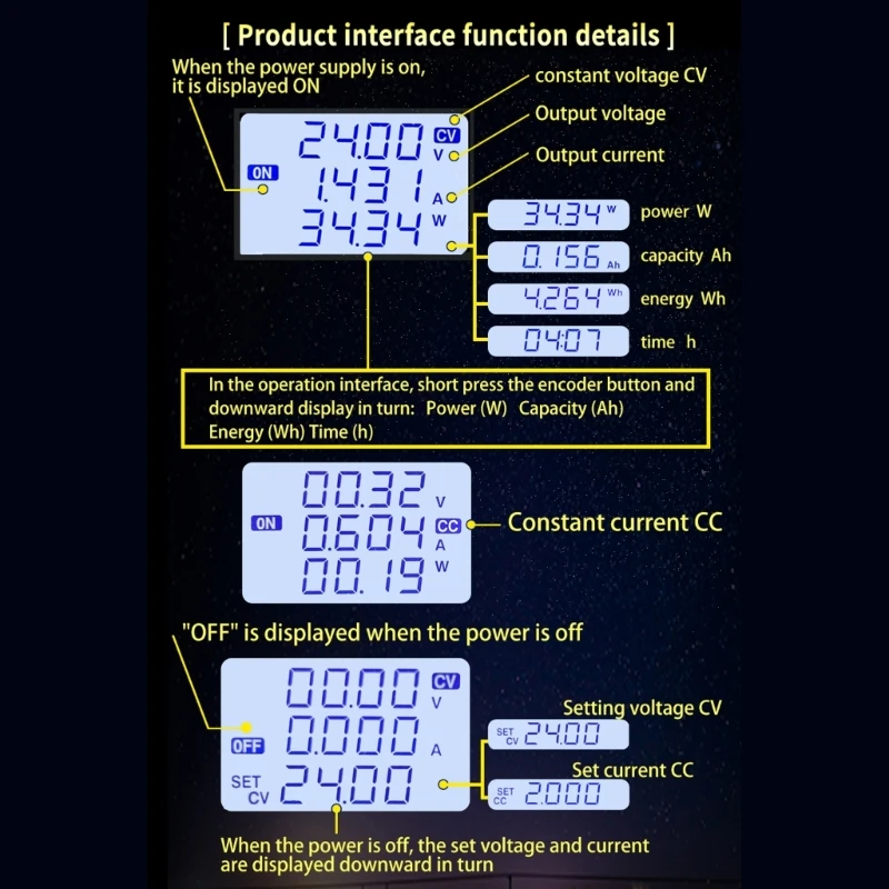 Cuando se configura CC, el valor de corriente constante se ajustará de forma predeterminada.Cuando se activa el LED, se puede realizar una atenuación rápida presionando la tecla ARRIBA/ABAJO, ¡lo cual es muy conveniente!